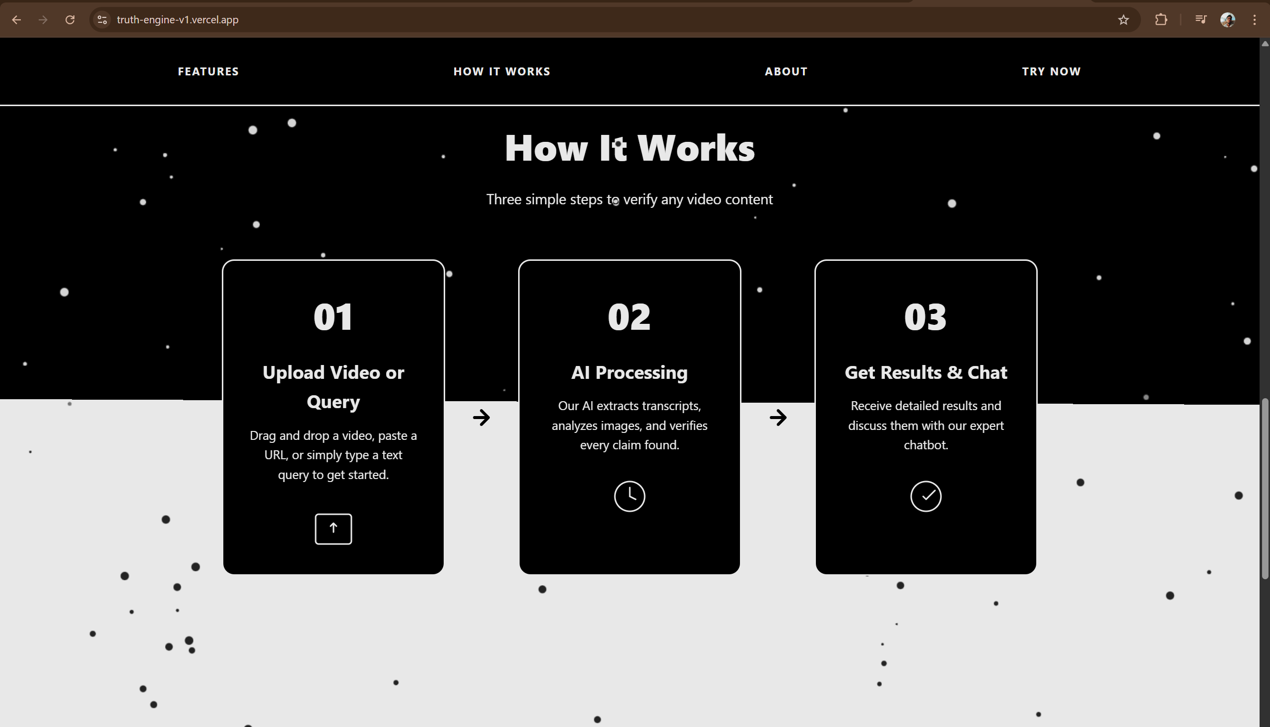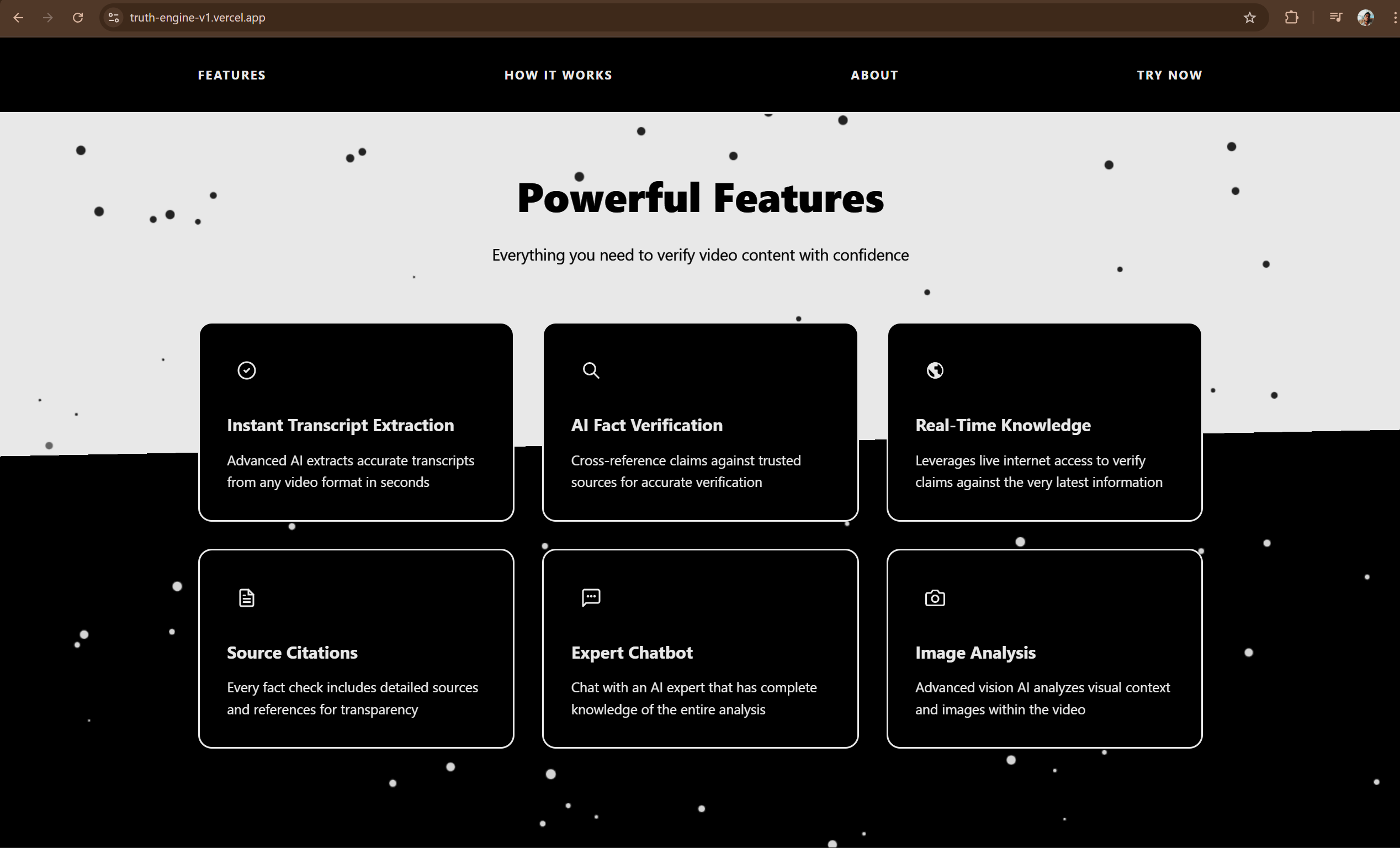 Built with React + Vite featuring a Future Interface aesthetic. GSAP powers high-performance animations with a glassmorphic design that organizes complex data into digestible Verdict Cards. The landing page features a spinning background representing the journey toward truth.
