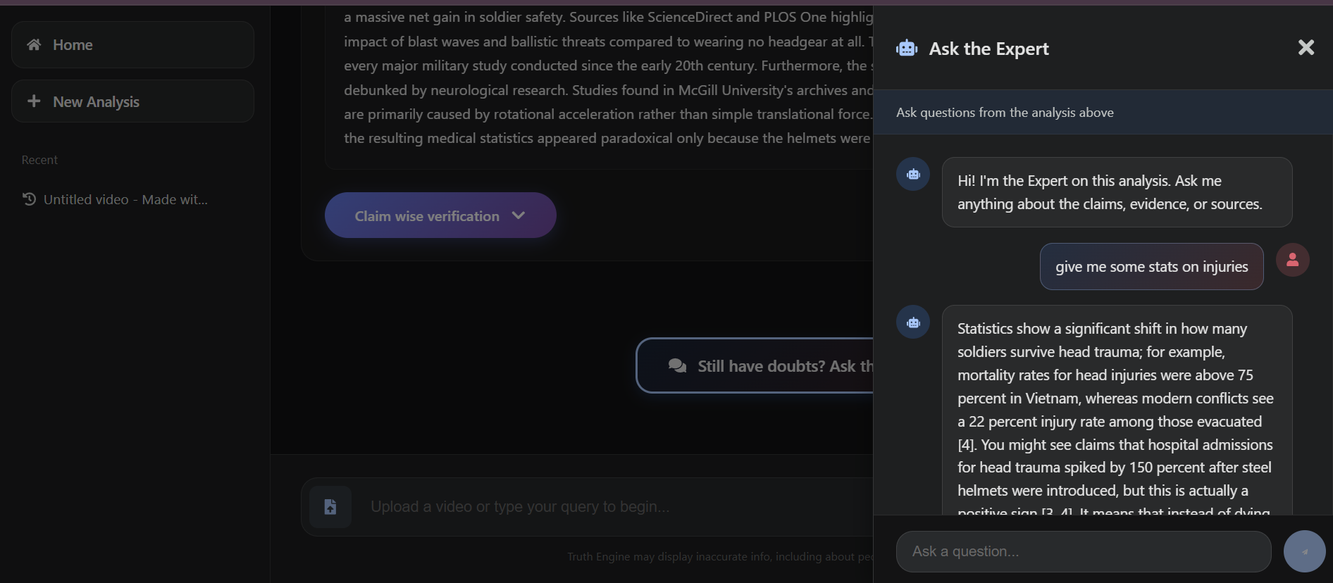 We also realized that there is no dedicated truth or fact-checker general tool especially for videos. When we tried using standard LLMs to check these narratives, the results were often disappointing. They were either biased, prone to hallucination, or simply summarized the top few search results without deep investigation. If the training data didn't cover the specific niche topic, the LLM would confidently state falsehoods or miss the nuance entirely.