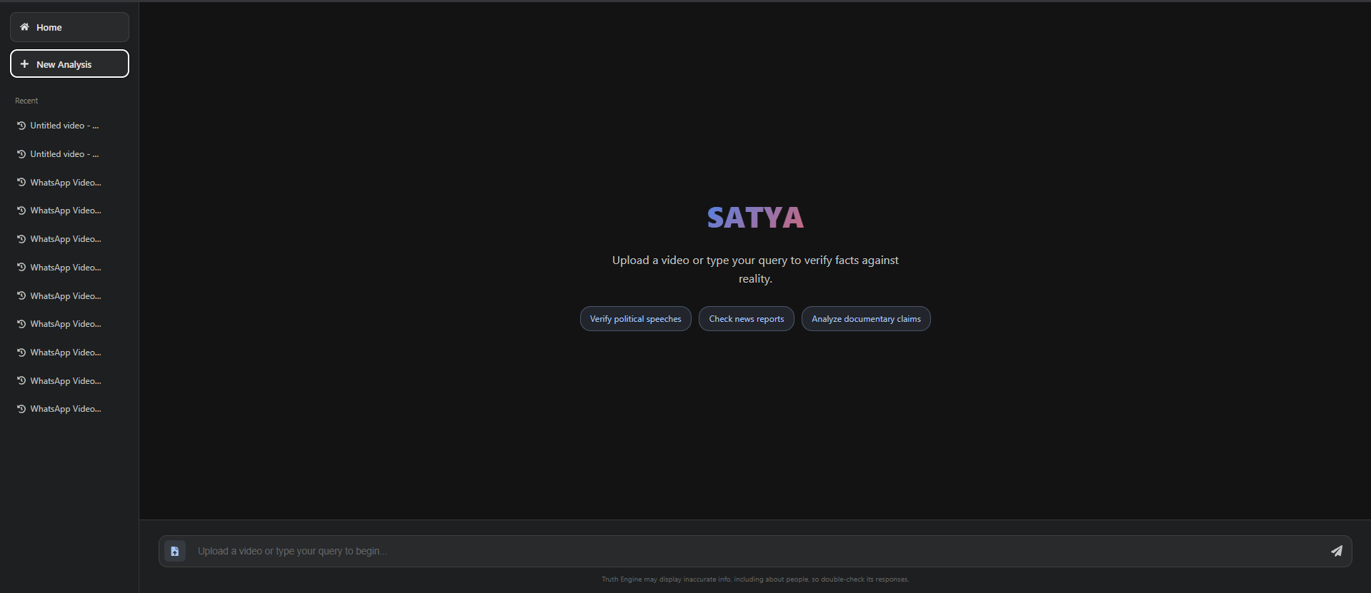 SATYA is an autonomous investigative platform that verifies video content or a general query comprising of claims and implication with the rigor of a professional research team. Unlike standard tools that look for literal keyword matches or solely depends on the top websites showing up on the internet, SATYA understands implication — what the video is trying to make you believe, not just what it says.