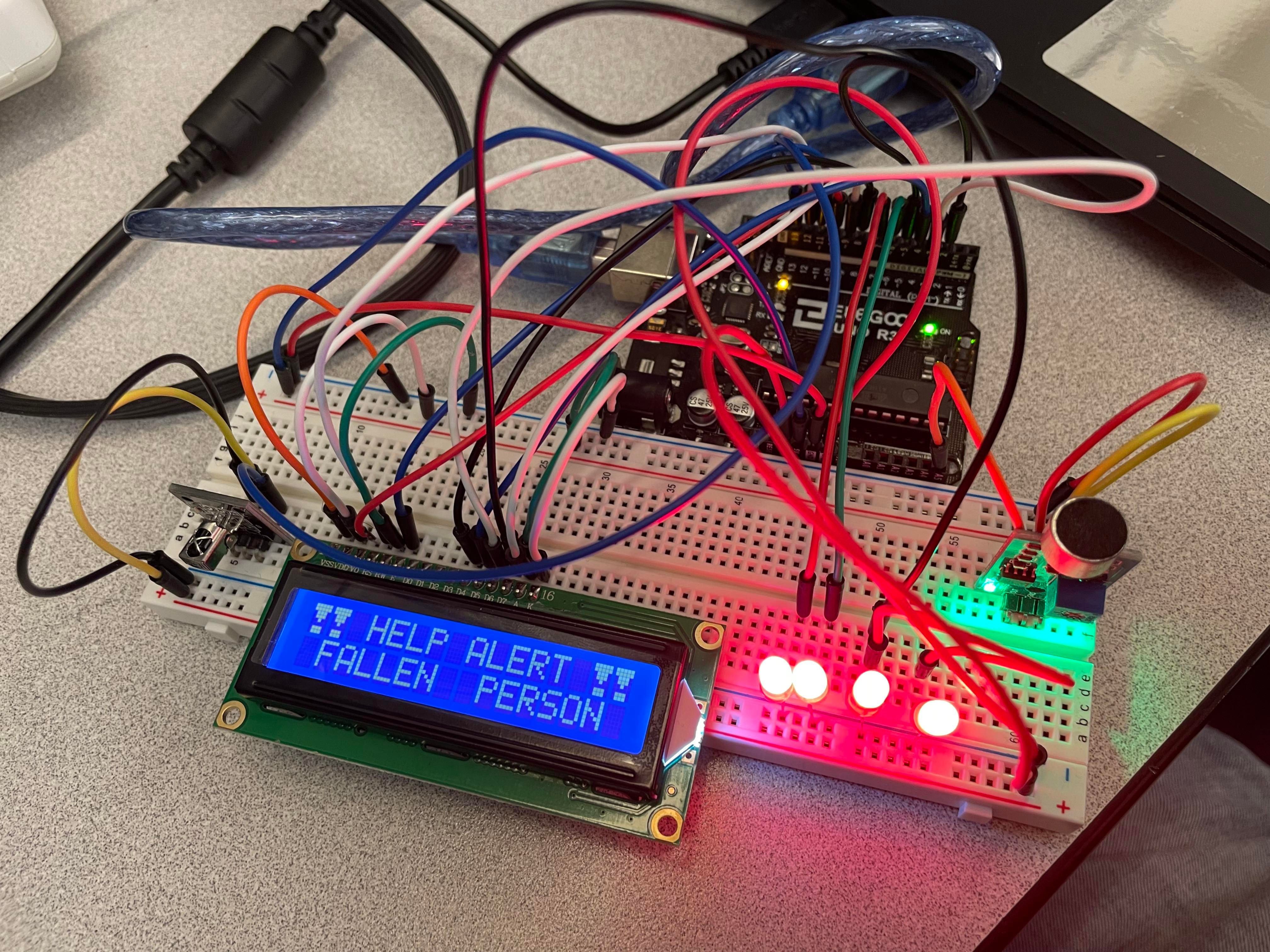 Save The Fallen is built using parts from an Arduino Uno, LCD display, LED lights, IR sensor, IR remote, and sound sensor module. Using the Arduino program, I programmed functionality into the buttons, text to display on the LCD screen, as well as the flashing LED lights.