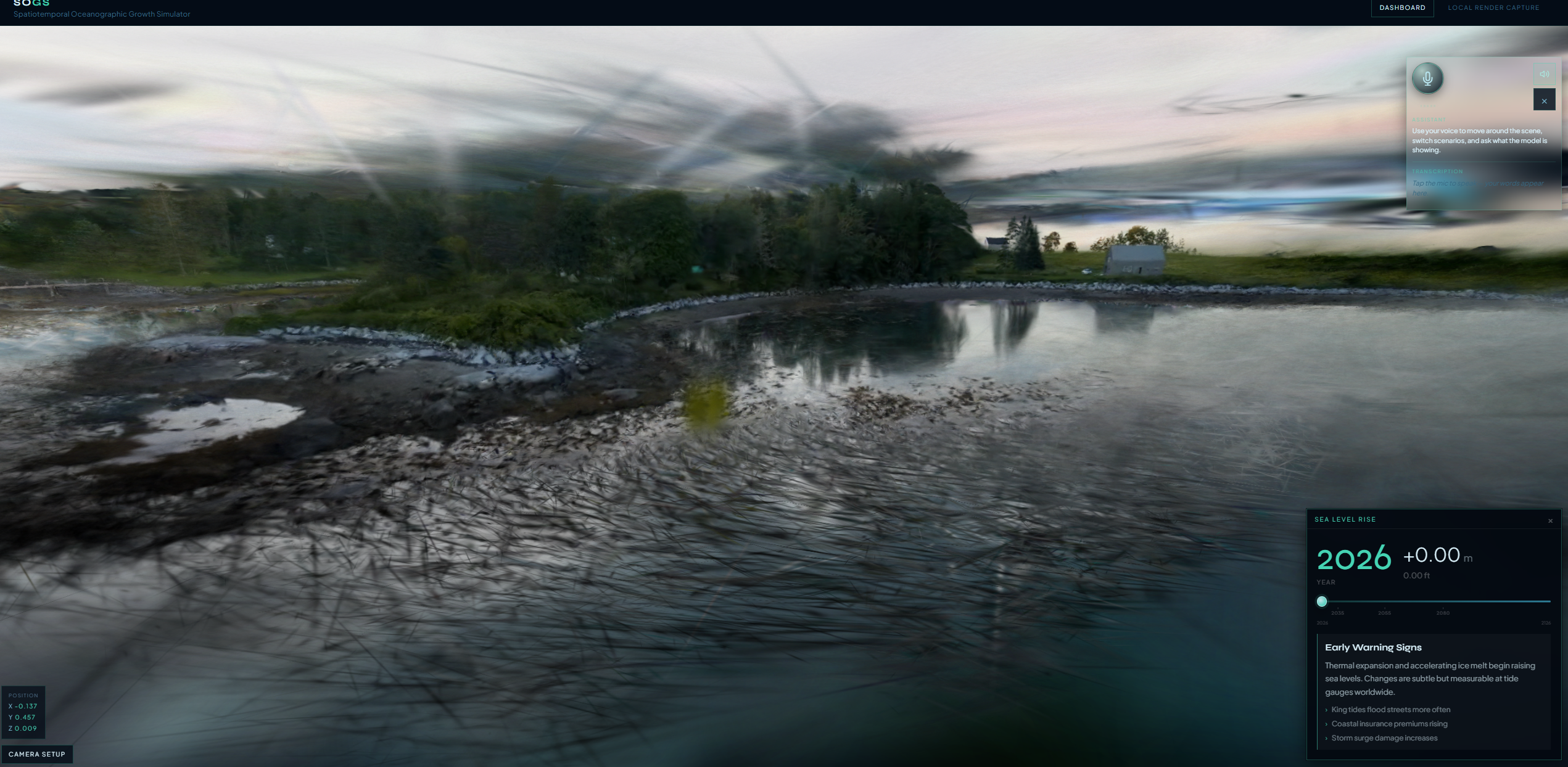 Sea-level rise is often communicated as global averages or static maps. We wanted something closer to standing in place: a splat or PLY scene you can orbit, preset viewpoints that match how people describe a waterfront (“pier,” “ferry terminal”), and a single rise signal driving both stats and the visual water line. Voice lowers the barrier for demoing under time pressure and matches the “explain like I’m on the shore” story.