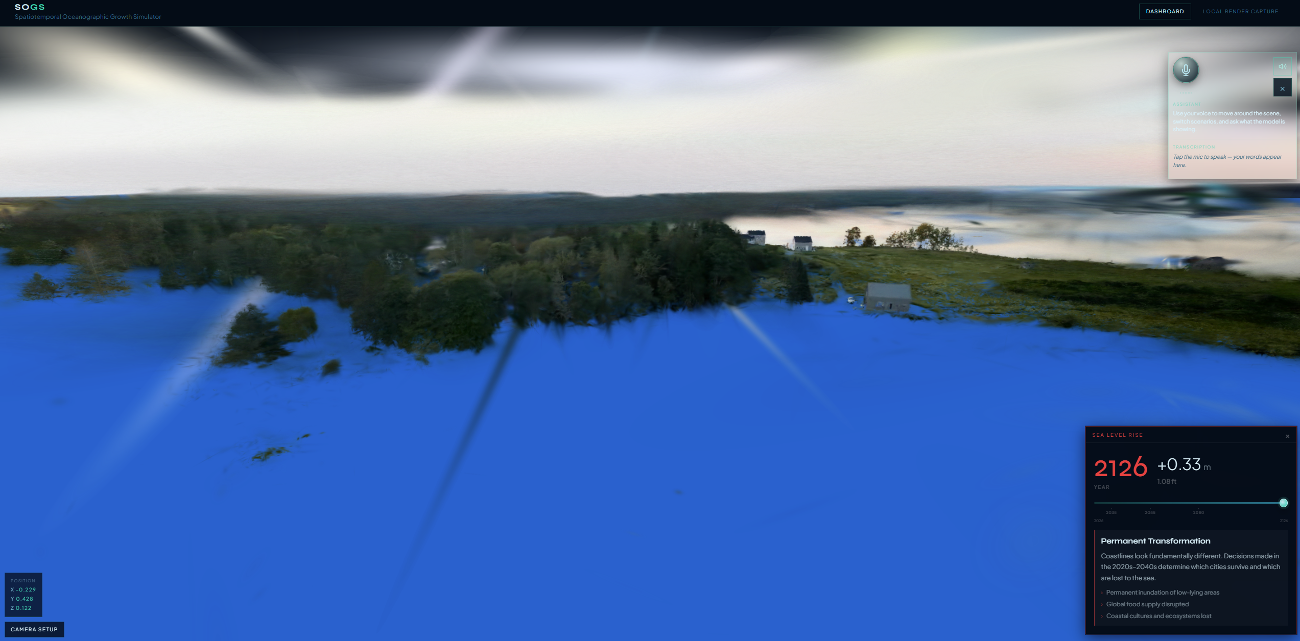 Sojs is a voice-guided, 3D sea-level rise explorer: you open a real place reconstructed as a point cloud / Gaussian splat, scrub time and scenarios, and talk to the scene—move the camera to named viewpoints, compare futures, and (where configured) run a hazard scan with plain-language narration. The goal is to make abstract climate numbers feel spatial and personal before the full prediction pipeline is wired in.