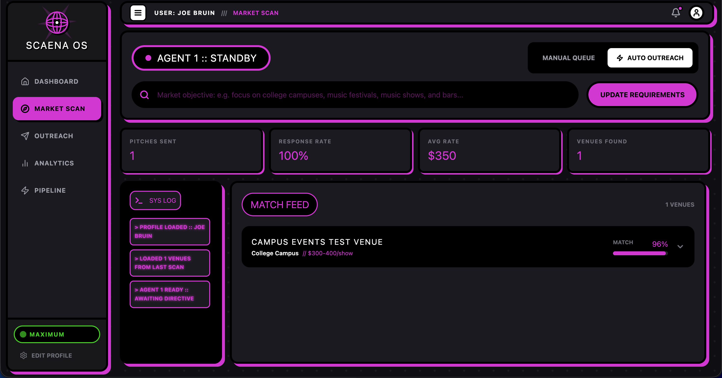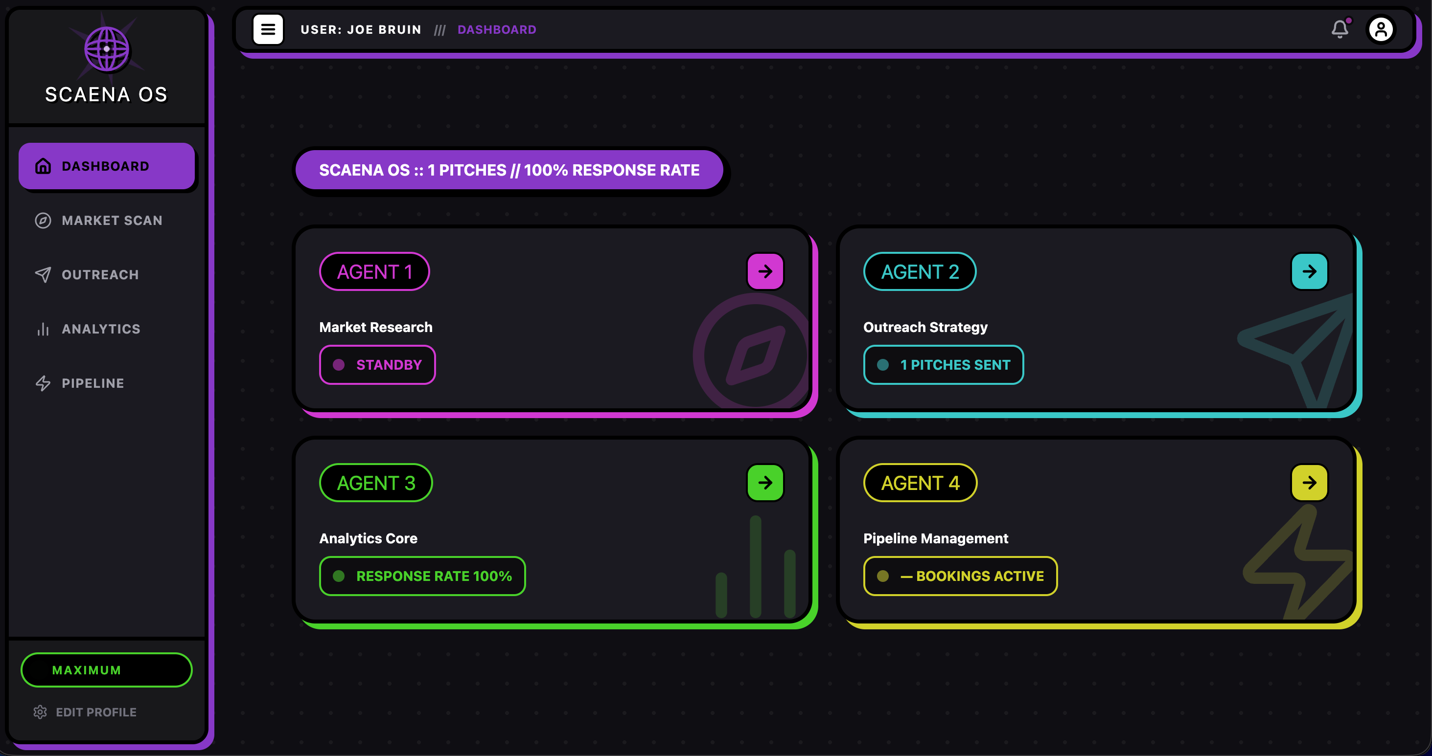 Scaena OS is a four-agent AI system that automates the full booking pipeline for any artist type: rappers, musicians, DJs, comedians, speakers.