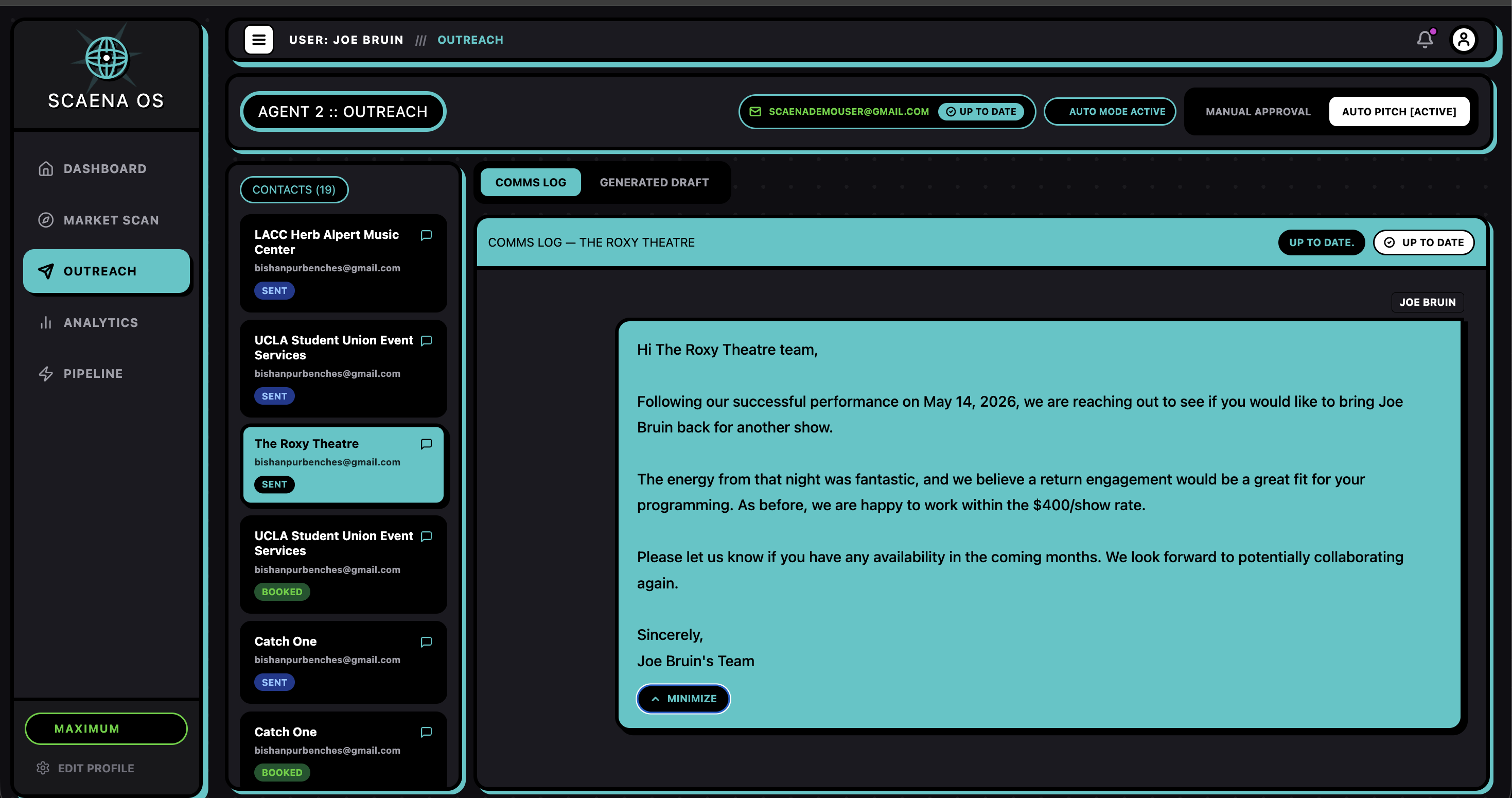 We built Scaena OS to be that team. An AI system that acts as your booking agent, handling research, outreach, follow-ups, and pipeline management so you can stay focused on the craft. Not just a tool. An agent working on your behalf.