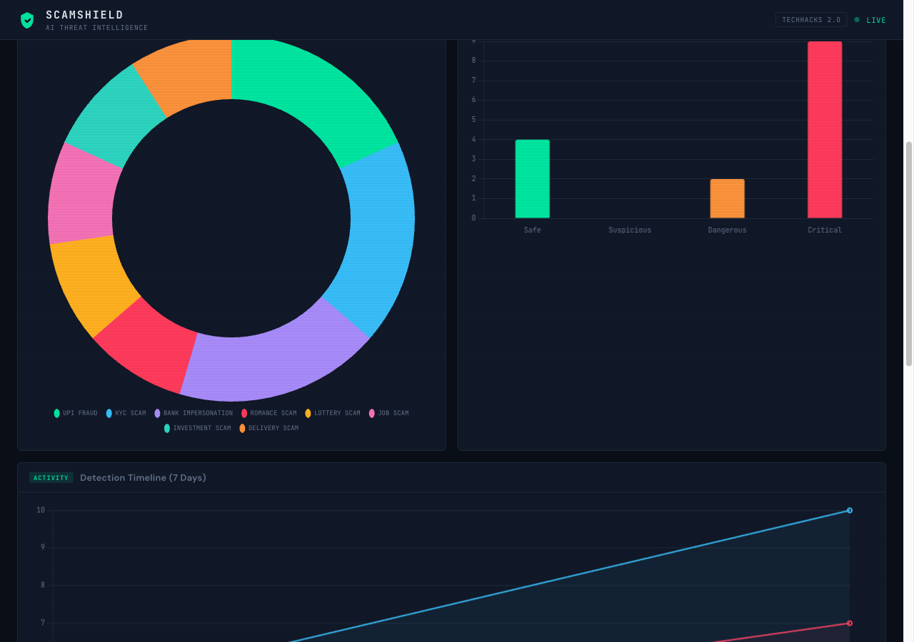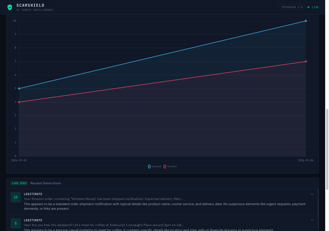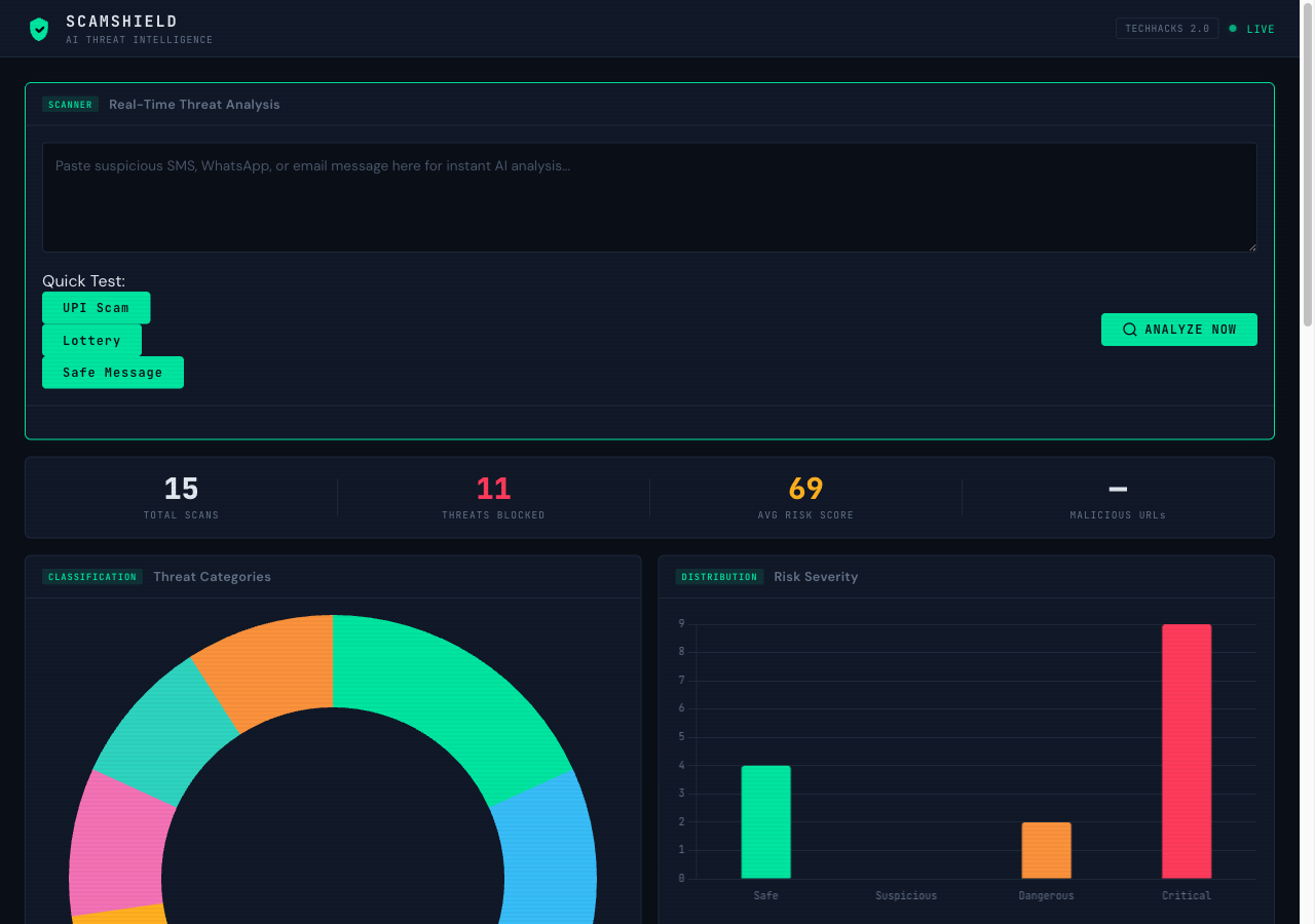 ScamShield is an AI-powered scam detection platform that analyzes suspicious messages in real-time. Users can: