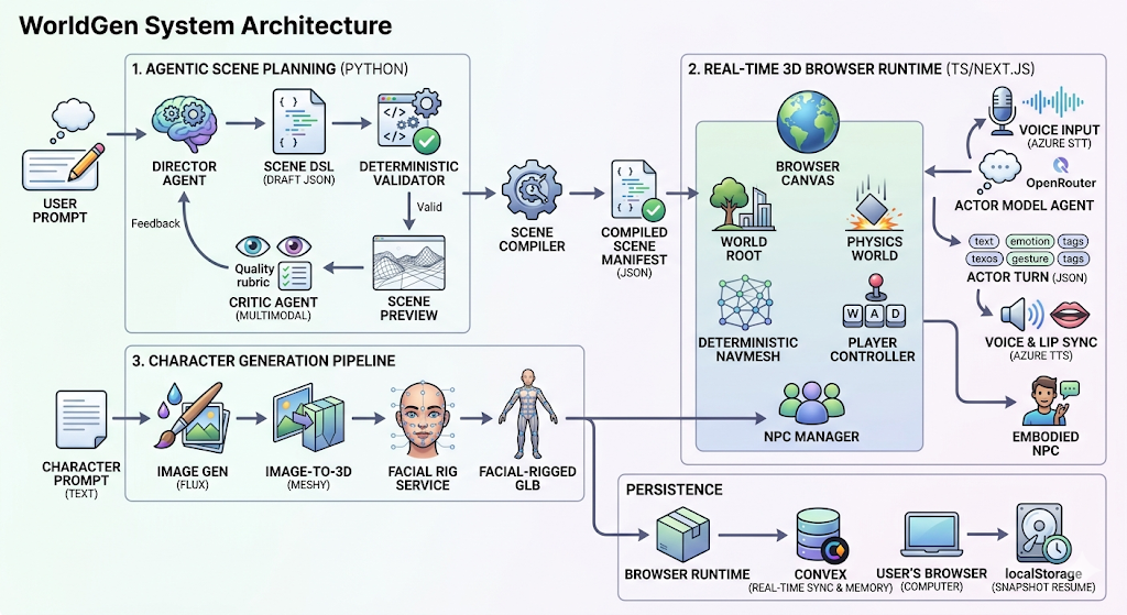 We built WorldGen as a full agentic 3D world pipeline. On the orchestration side, we used Python + FastAPI with OpenRouter-routed models including K2 Think V2 for scene planning, Gemini for structured world building, and Qwen3-VL-32B as a visual critic. Those models generate and refine a typed Scene DSL, which is then checked with Zod-based schemas and passed through a deterministic validator/compiler layer for asset checks, spatial rules, overlap detection, walkability, and scene assembly.