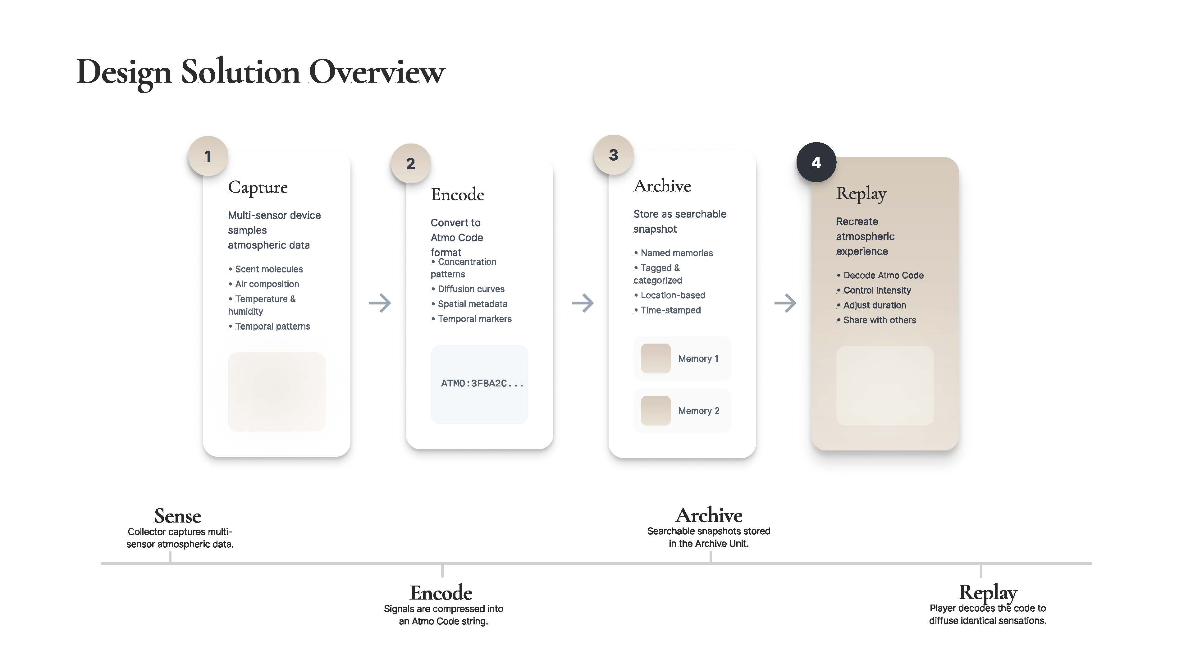 Using a multi-sensor device called the Collector, environmental data such as scent intensity, air composition, temperature, and humidity is sampled and encoded into a standardized structure called Atmo Code.