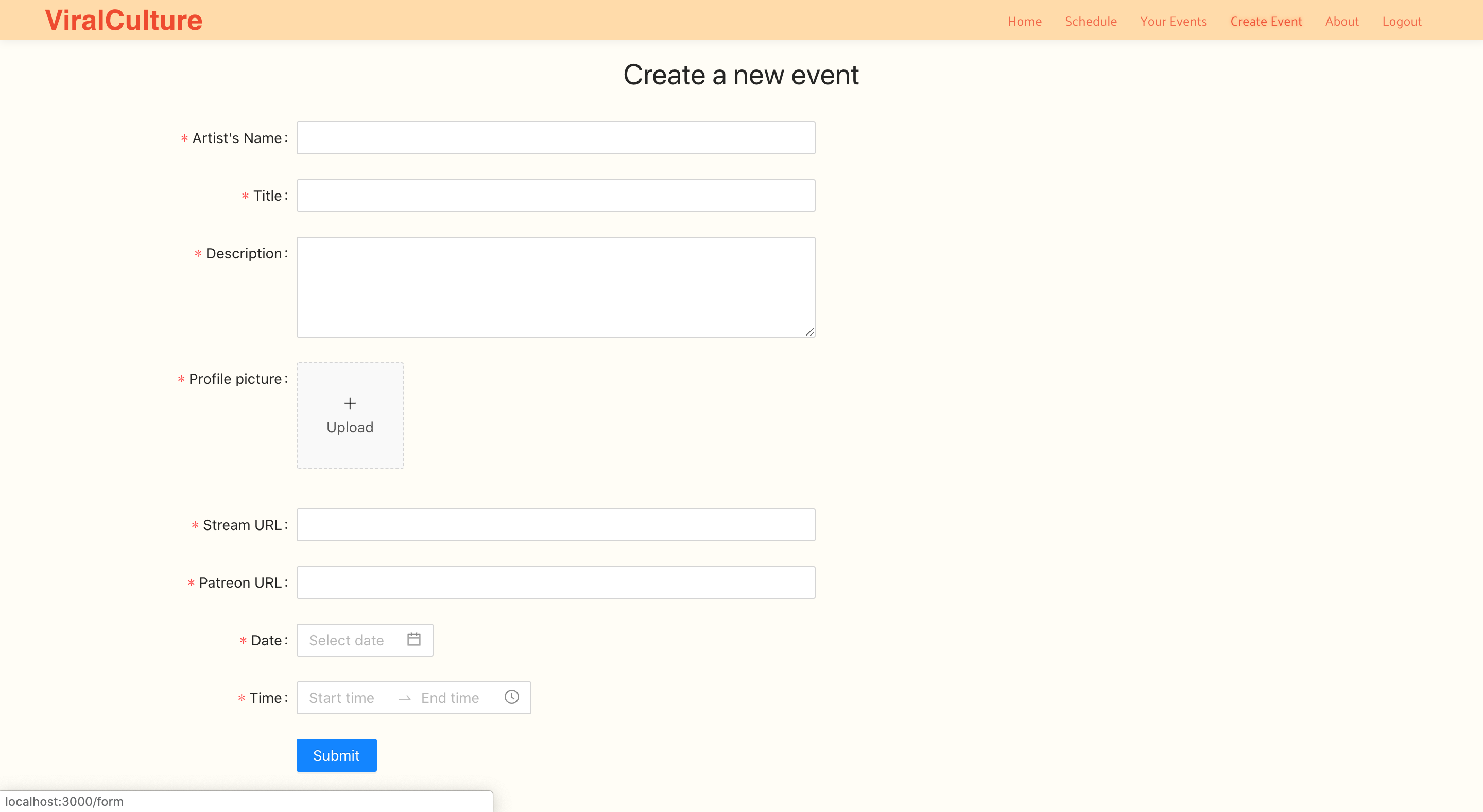 Our platform lists a schedule of live cultural events posted by the content creators, in a way that is visually appealing and simple to understand. Each event has a link to the page from which the content is streamed, so that logged in users may simply watch that stream on our page.