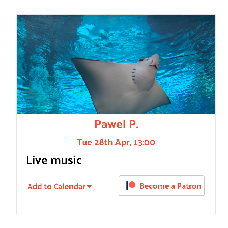 Each event card includes a link to the content creator’s Patreon account, enabling direct financial support.