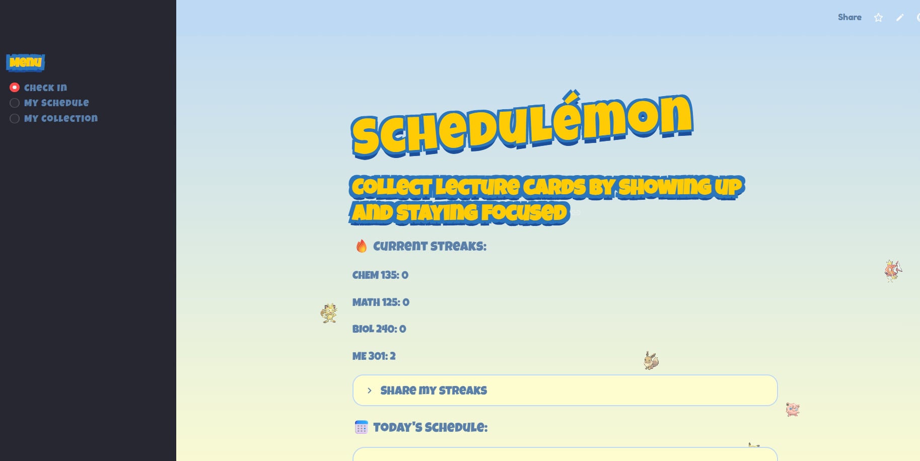 Schedulémon is a gamified class attendance and focus tracker. Students check into class only when they are physically present using GPS verification. By staying in class for the full session, they earn collectible Pokémon-style cards and build streaks. The app also allows users to manage their schedules and share their progress or collections with others.