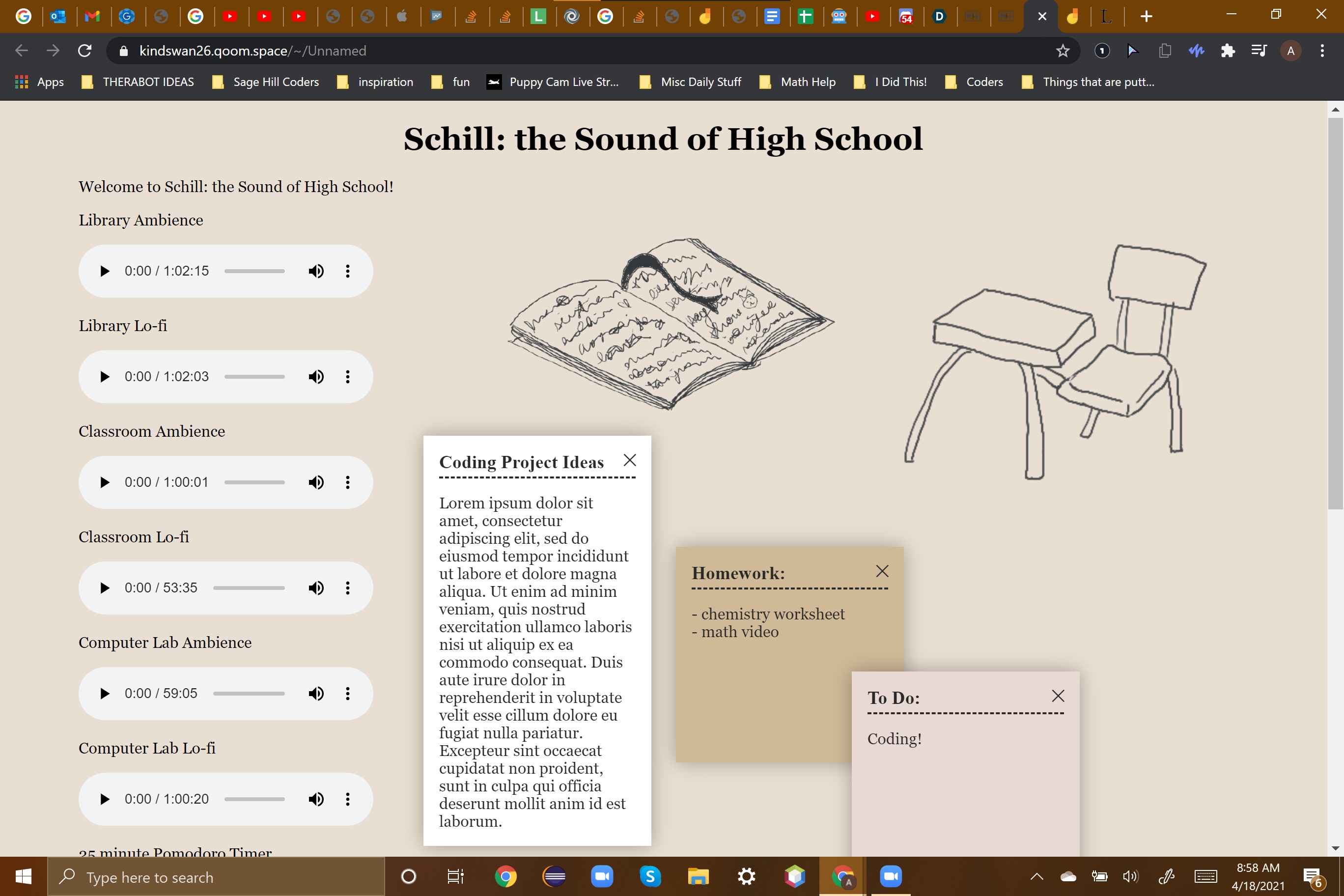 Our website has embedded audio files that play lo-fi and school noise ambience to replicate the school environment. The user can choose which files to play and adjust the volume of each. We also included several other productivity tools, such as a Pomodoro timer and customizable sticky notes.