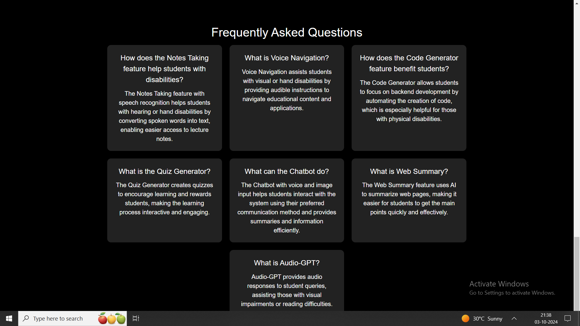 One of the biggest challenges we encountered was ensuring that the AI-driven features like voice navigation, YouTube summarization, and Audio-GPT were intuitive and accessible. Making sure that the platform could accommodate a wide variety of disabilities, while maintaining a user-friendly experience for ordinary students, also required extensive testing and iteration. Integration of diverse AI models for tasks like summarization and voice commands presented significant technical challenges as well.