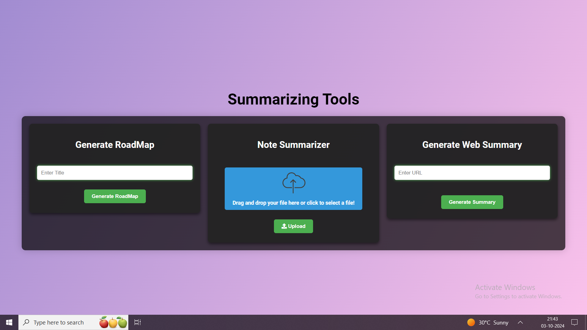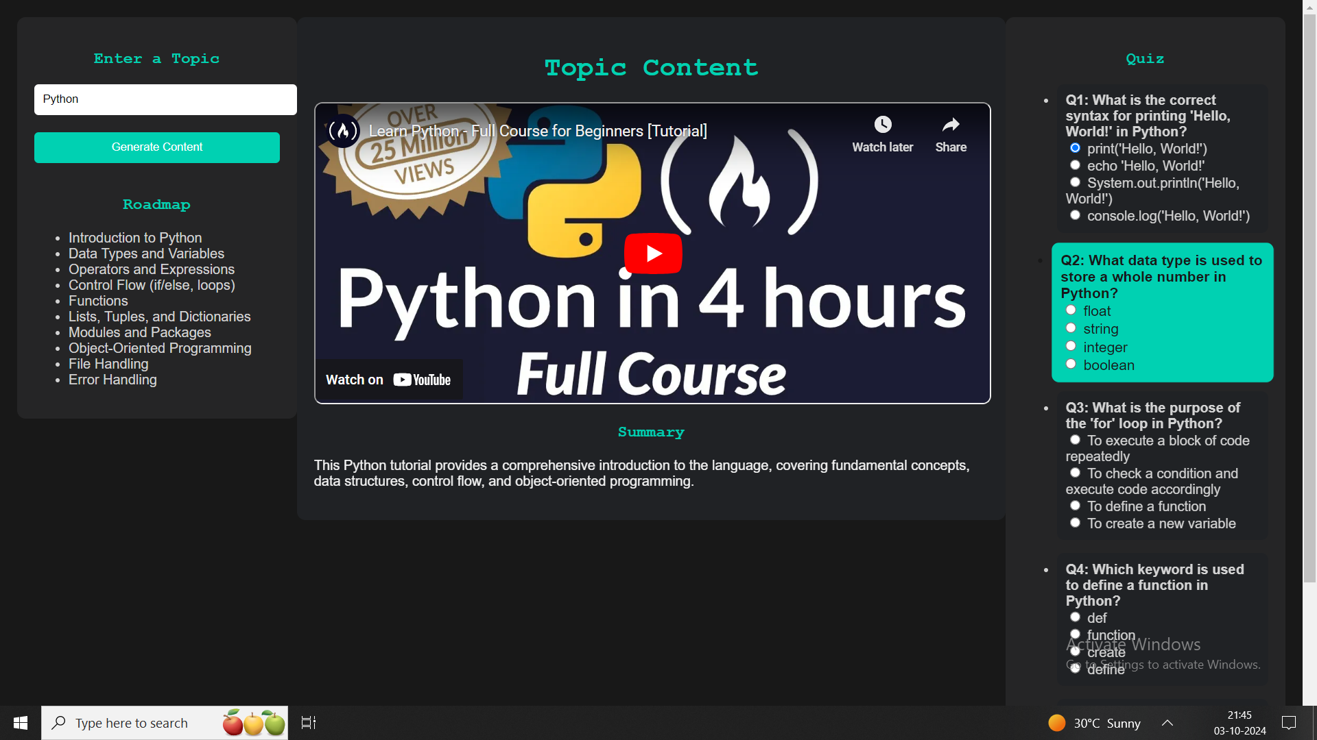 - YouTube Summarizer: Summarizes YouTube videos, generates learning roadmaps, and creates quizzes based on the video content.
