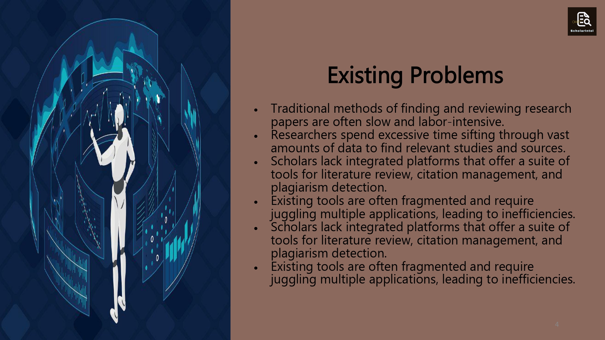 The world of research and academia is brimming with potential, but researchers often struggle with information overload, time constraints, and the challenge of making informed decisions. We were inspired to create ScholarIntel to bridge the gap between researchers and cutting-edge technology, empowering them to streamline their workflows, enhance collaboration, and focus on impactful discoveries. ScholarIntel was born out of the need for a comprehensive platform that supports researchers and scholars in every phase of their journey, from discovery to publication.