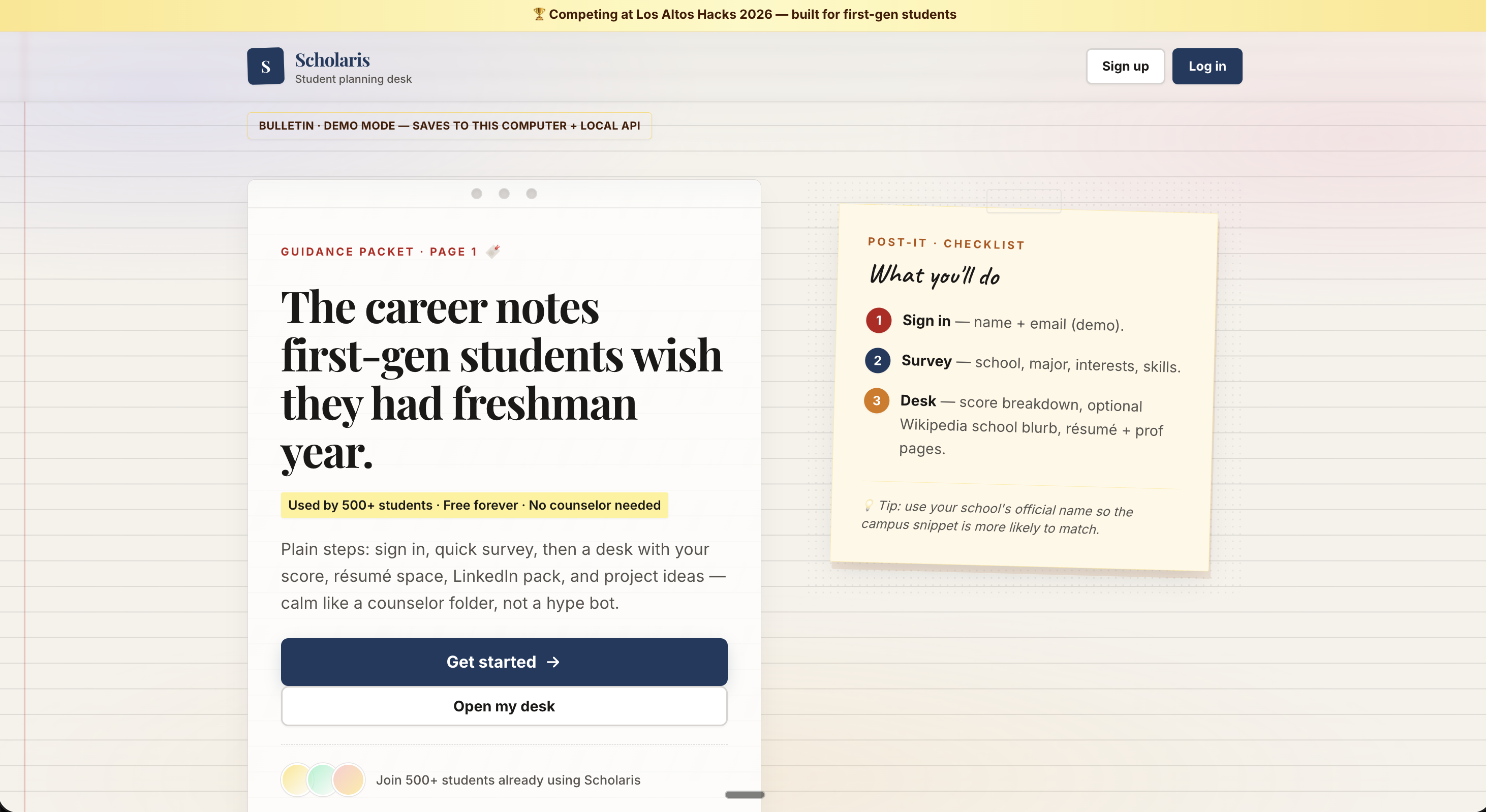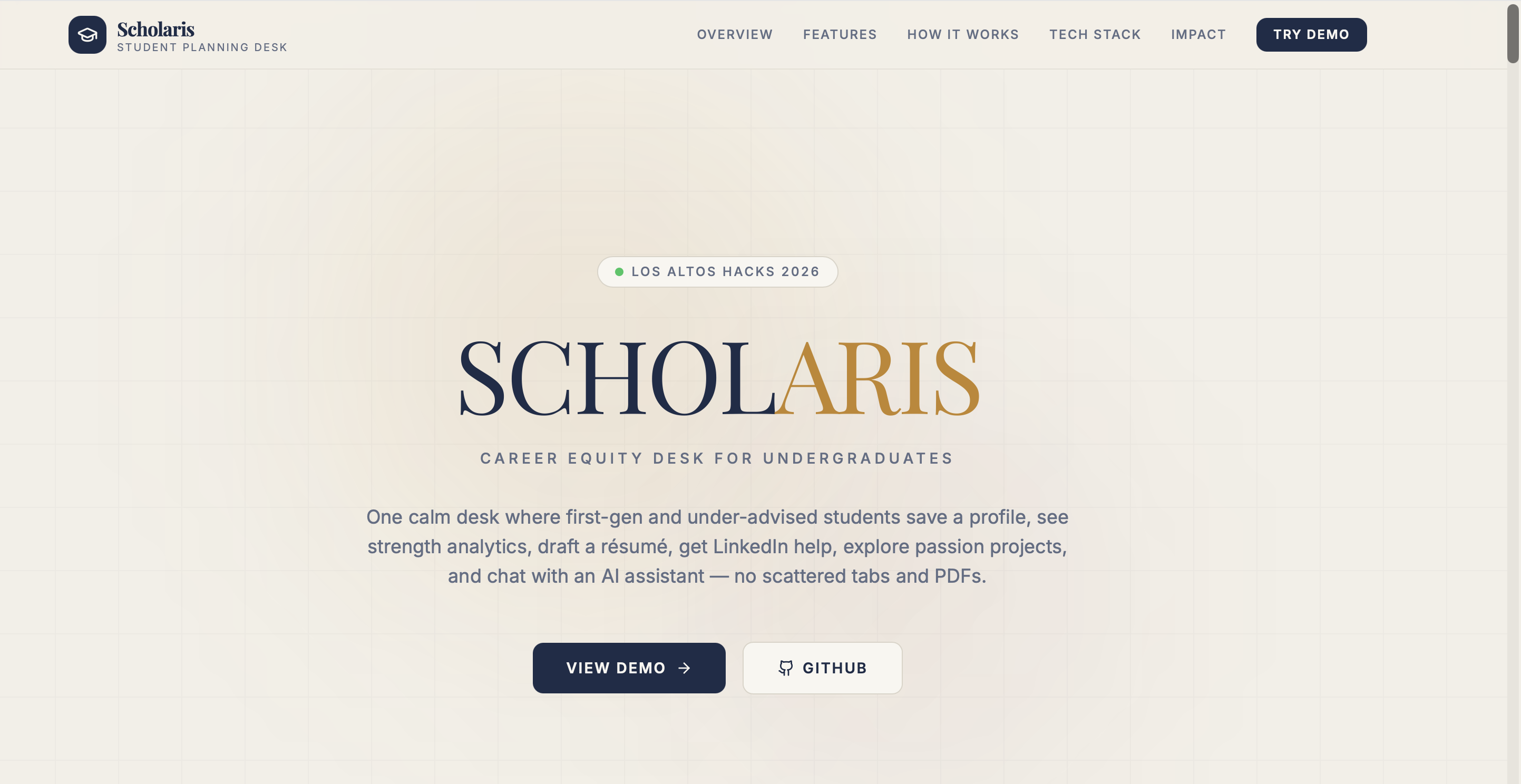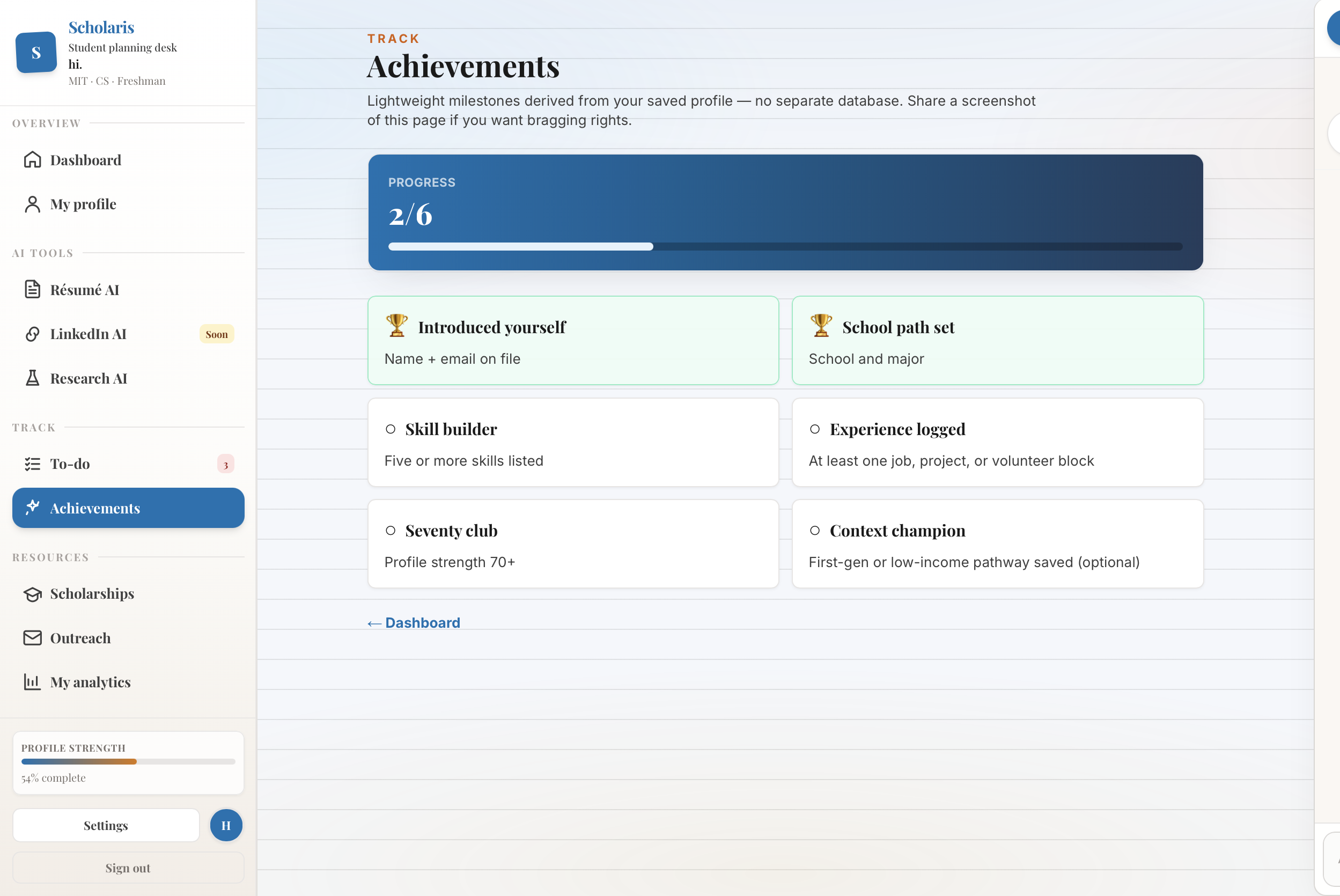 Scholaris is an AI-powered career equity platform built for first-generation and underrepresented high school and college students — giving them the same strategic advantage that privileged students get from family connections, prep school counselors, and expensive career coaches.