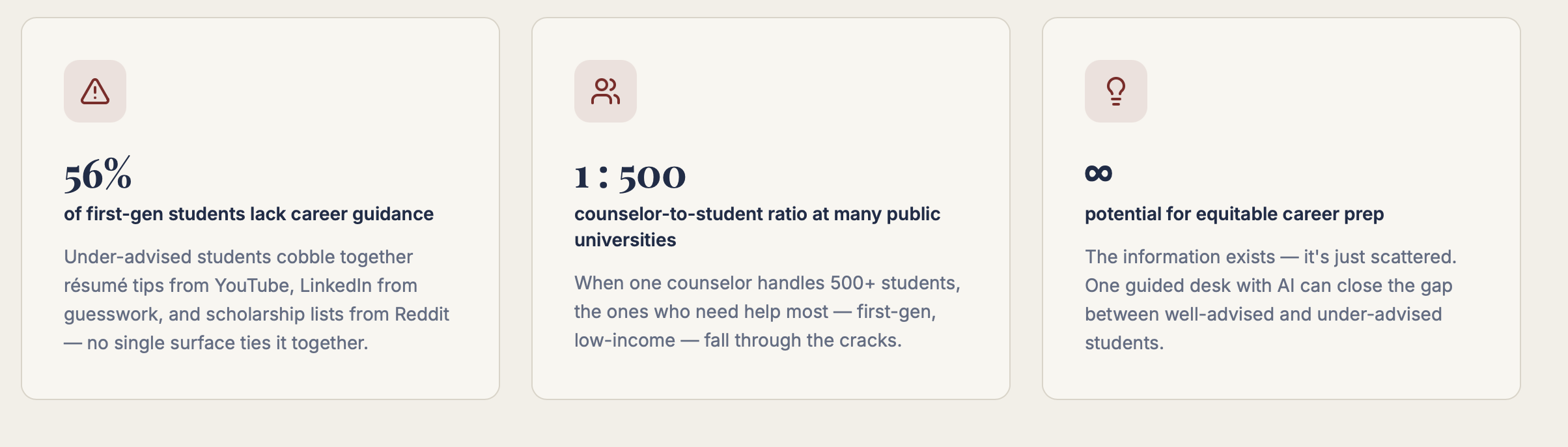 They assume you have parents who went to college, a counselor who knows your name, a network of alumni to cold-call, and enough free time to figure out what a CNAME record is. First-generation students don't have any of that.