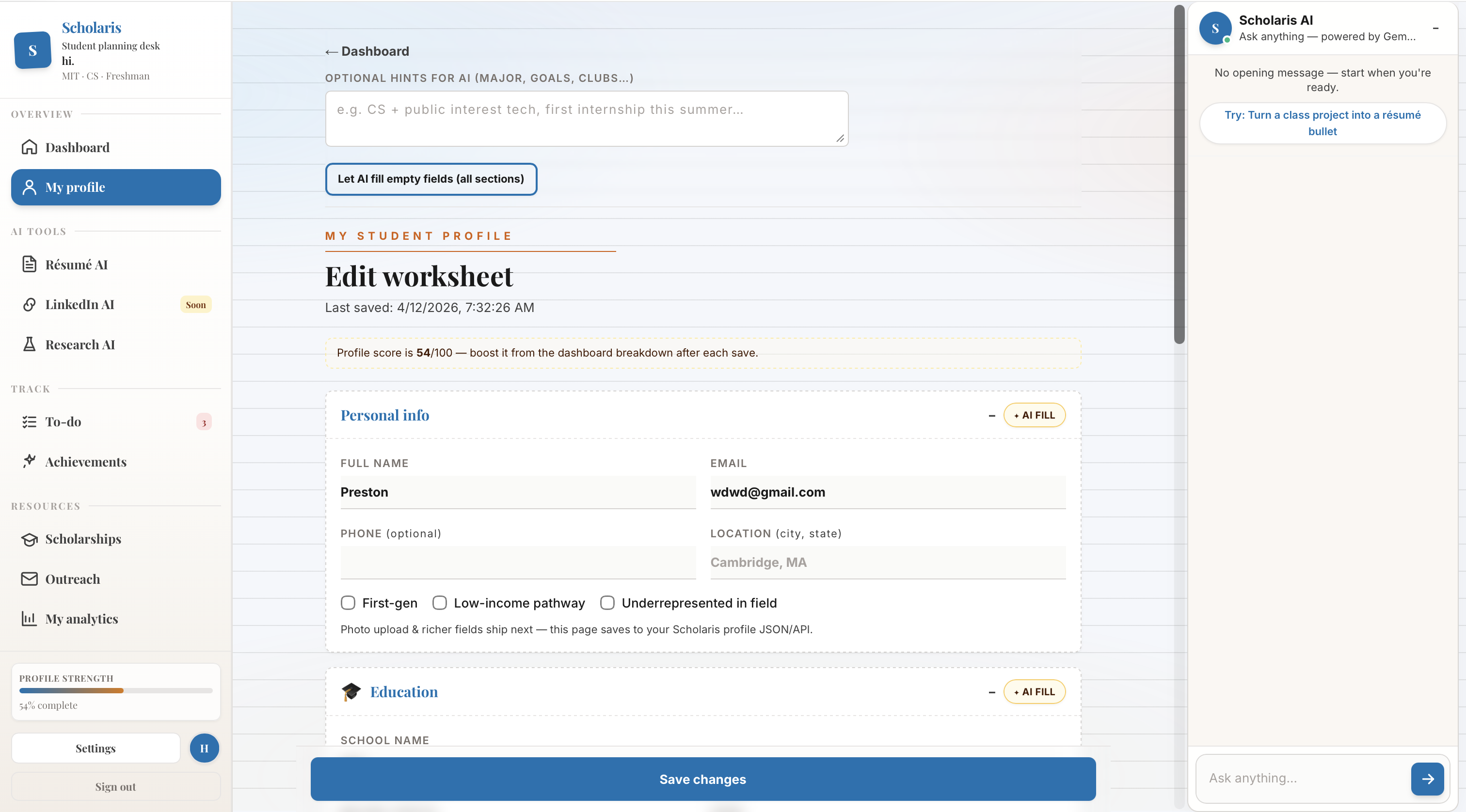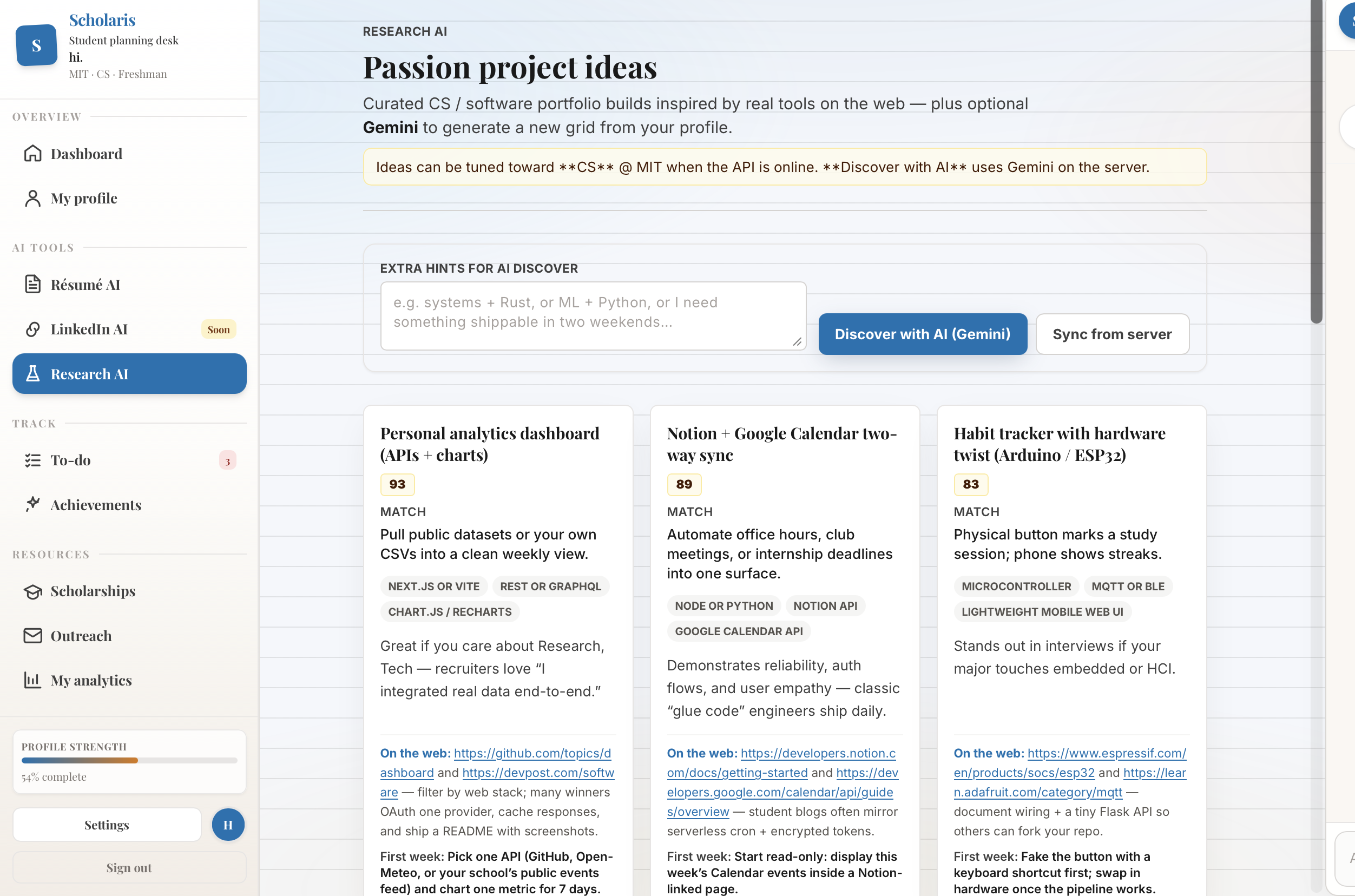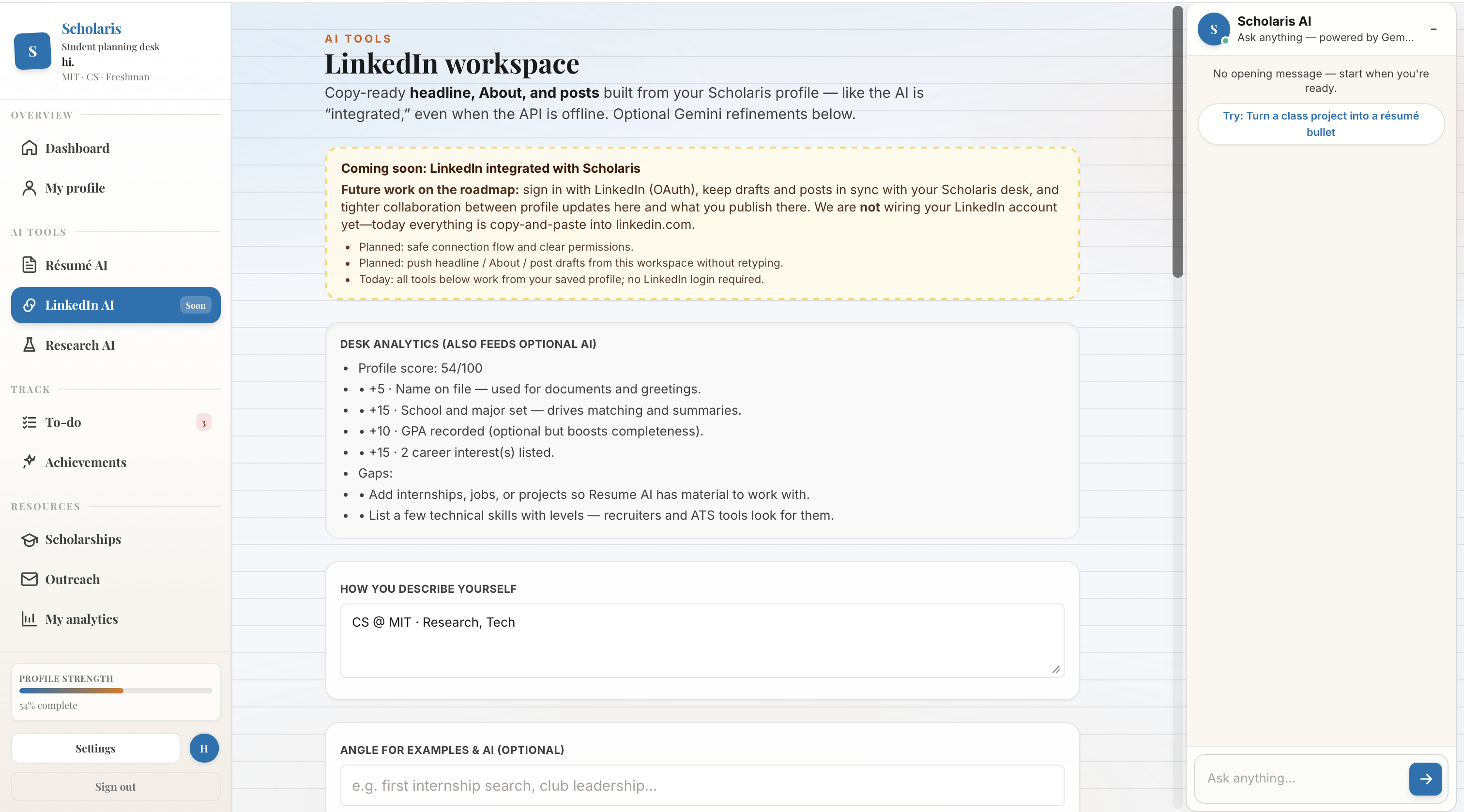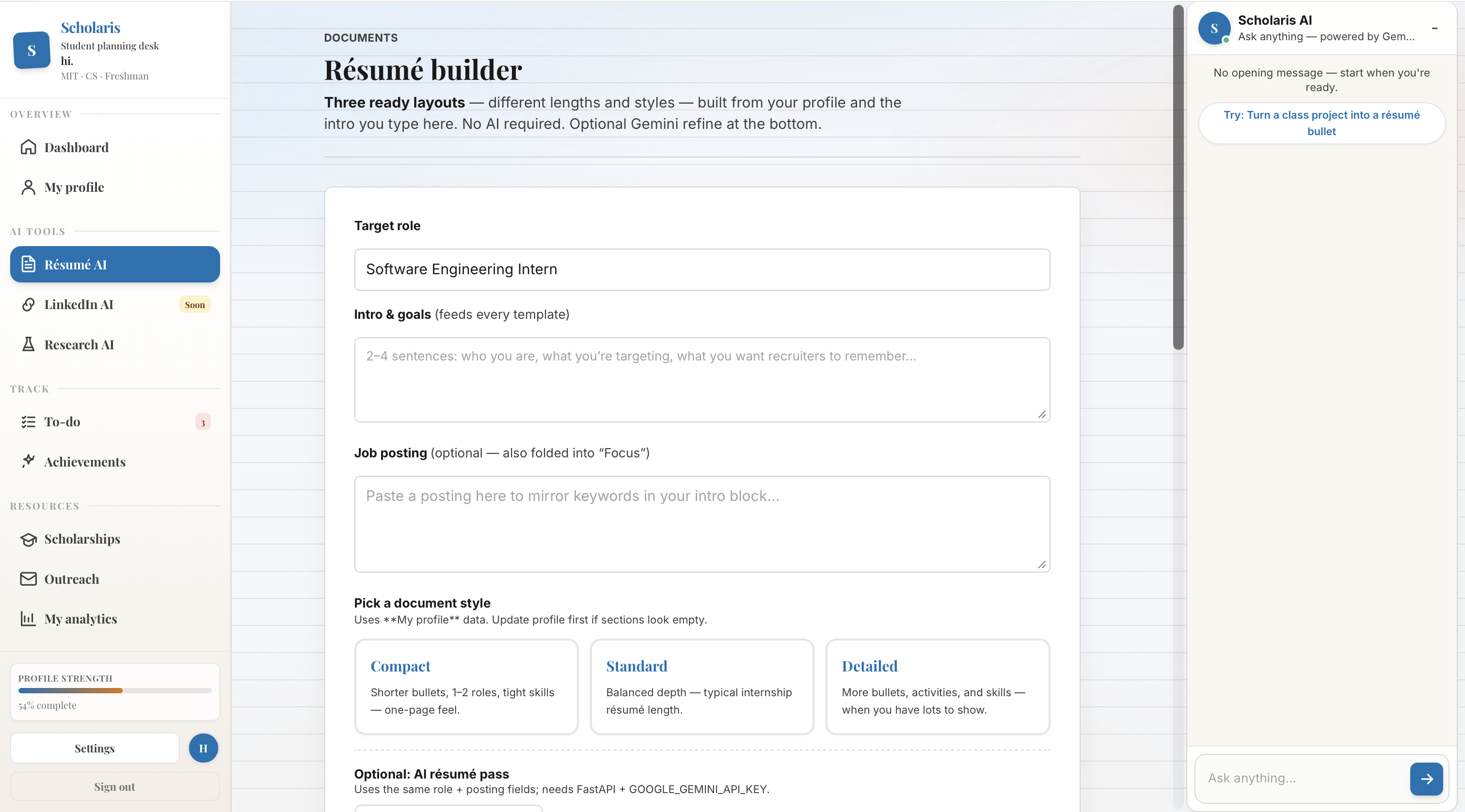 We built Scholaris because we've lived it. Figuring out how to write a resume, how to email a professor, how to even know what opportunities exist — none of it is written down anywhere. You either know someone who knows, or you miss it entirely. Our application gives students who are unable to afford a counselor, or do not have the same amount of resources that a normal student has.