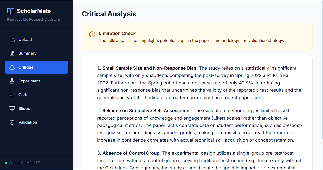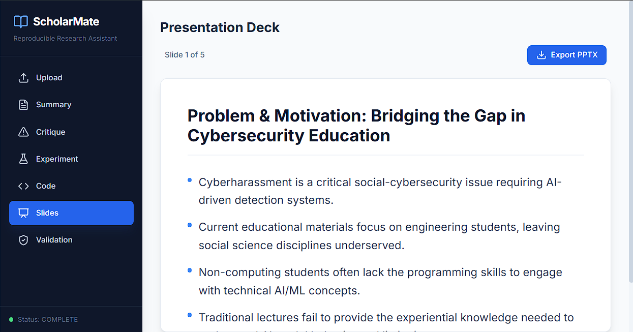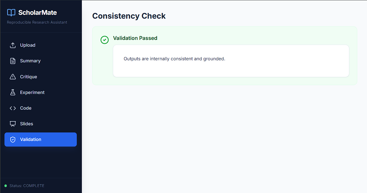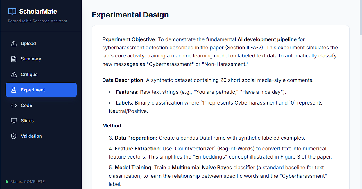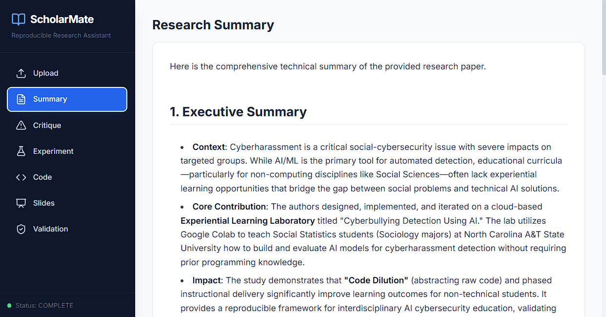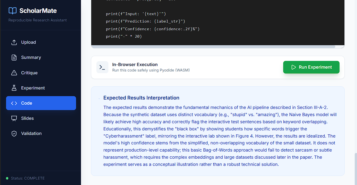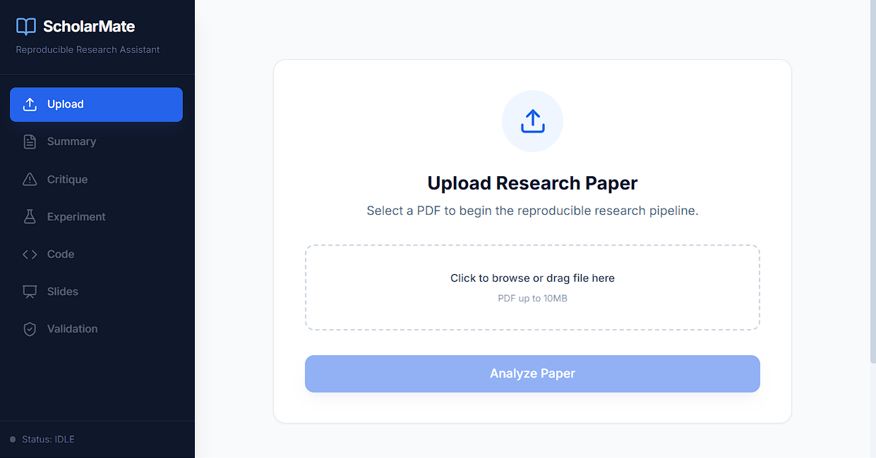Reading research papers is often a passive experience, especially for students and beginners. While papers explain what was done, they rarely make it easy to understand how to reproduce the results. I was inspired by the gap between reading a paper and actually running an experiment. ScholarMate was built to turn research from something you read into something you can run and explore.