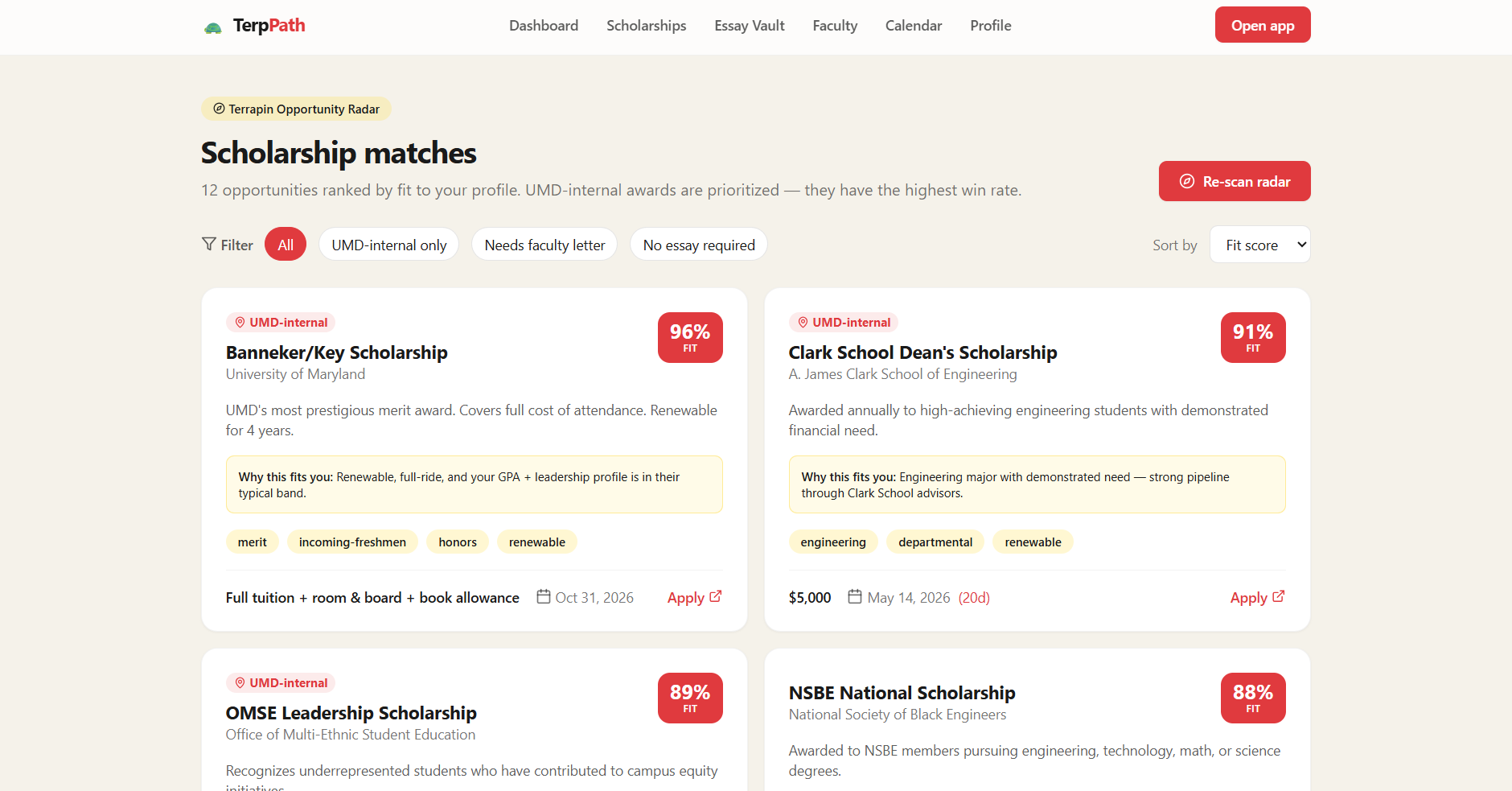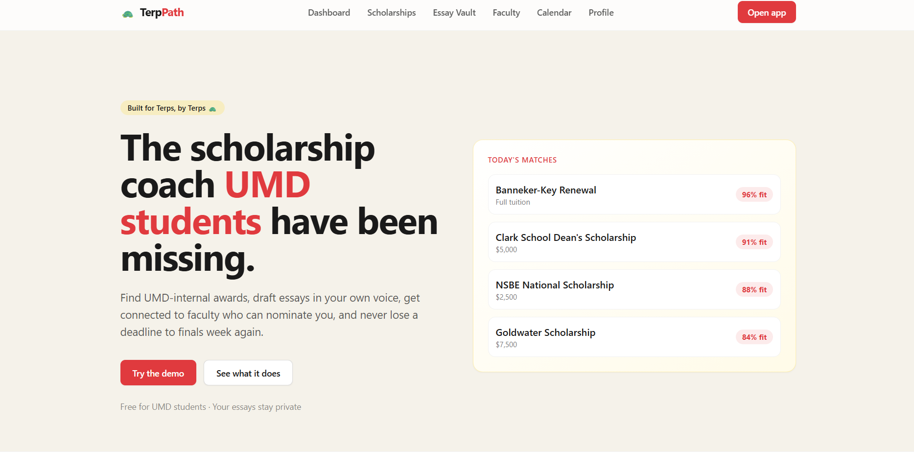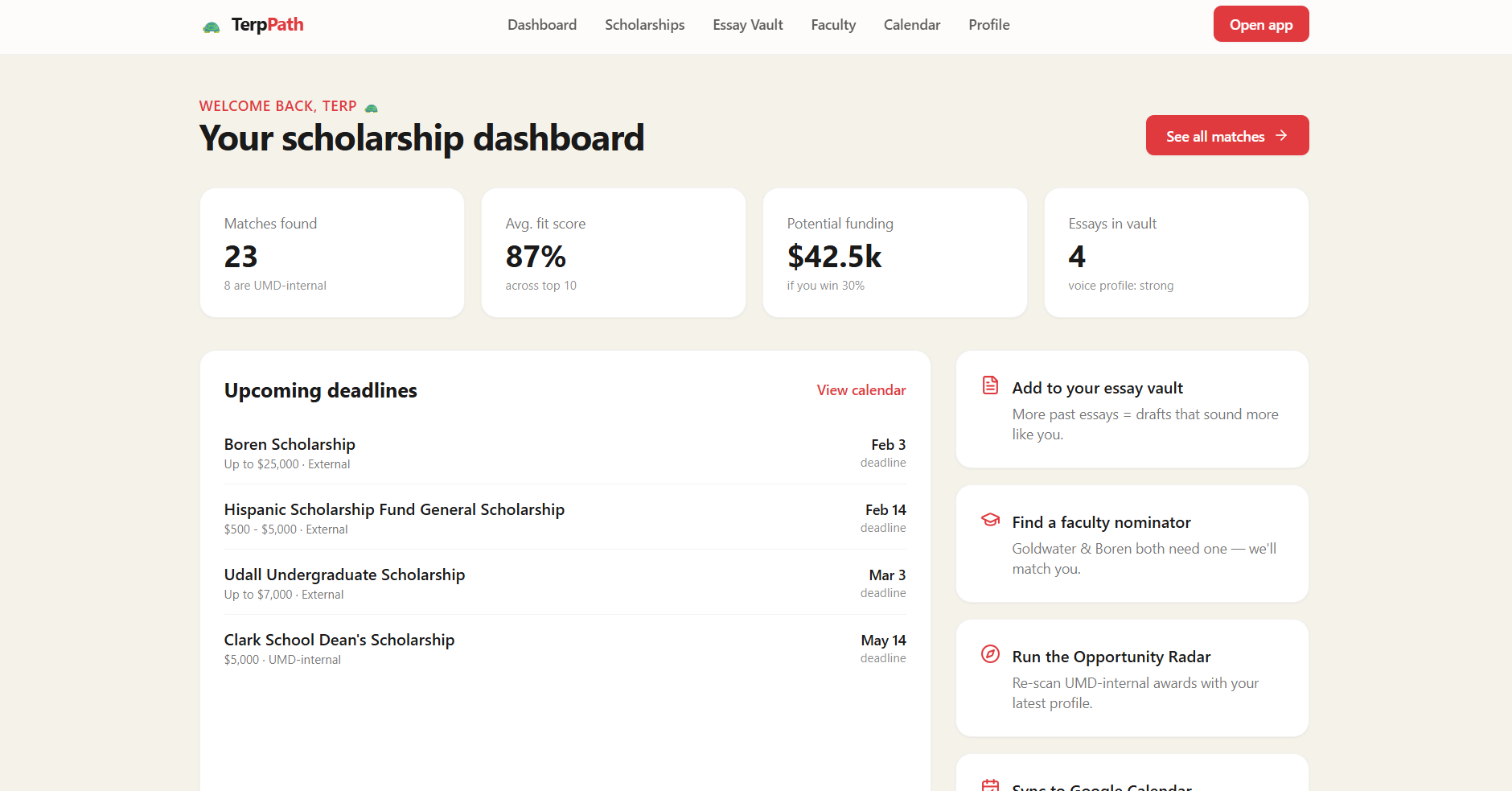 Many students at the University of Maryland miss out on scholarships they qualify for because the process is confusing, scattered, and time-consuming. As students ourselves, we saw how hard it is to find opportunities, manage deadlines, and write strong essays while balancing school. We wanted to build something that makes accessing funding simple and personal.