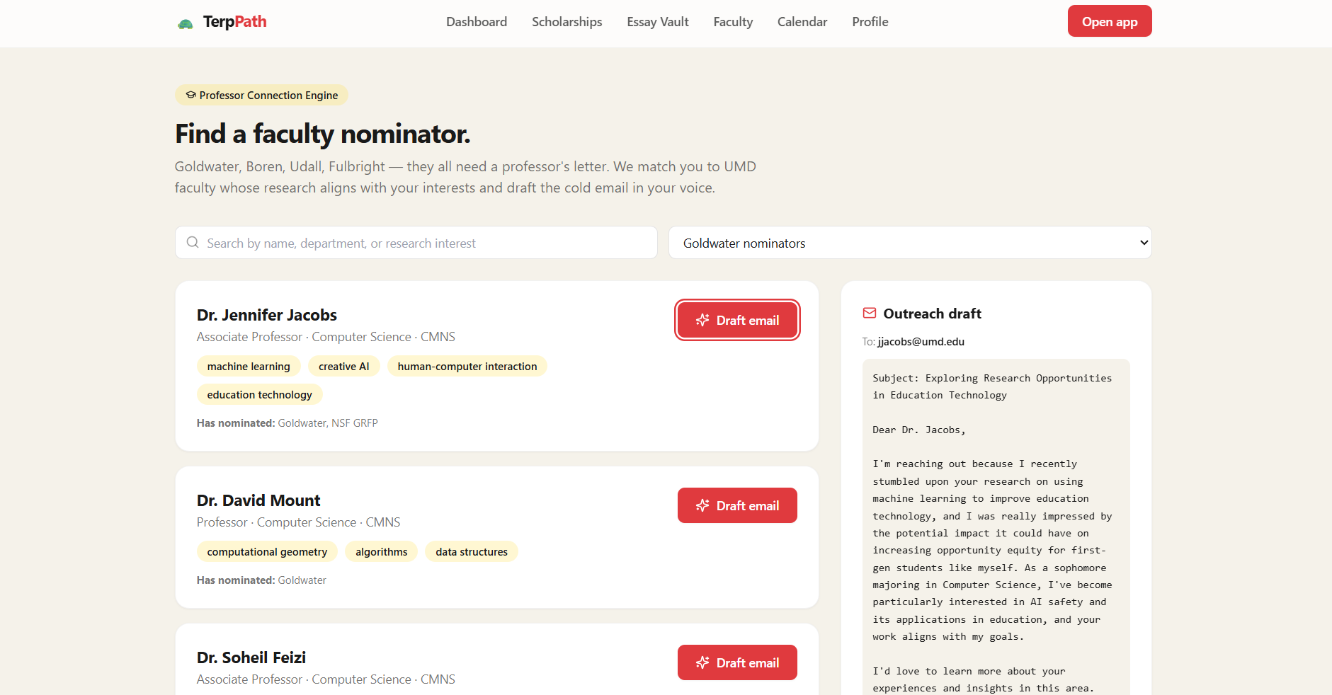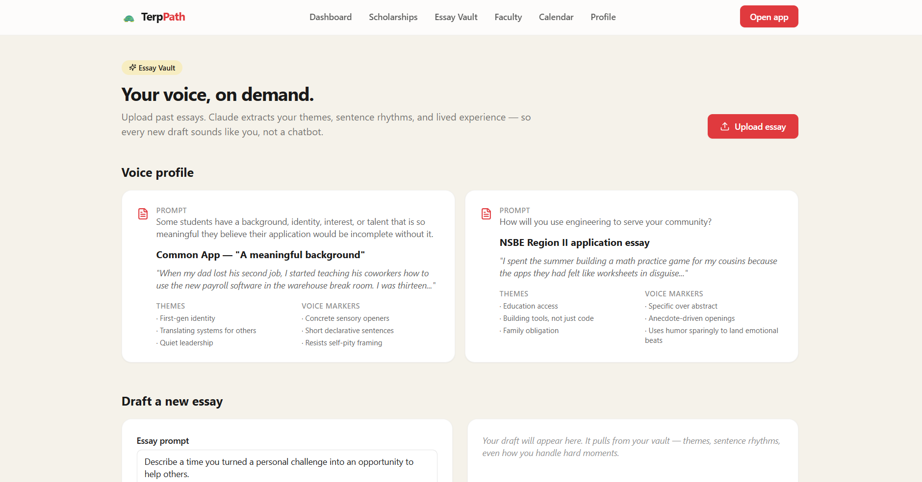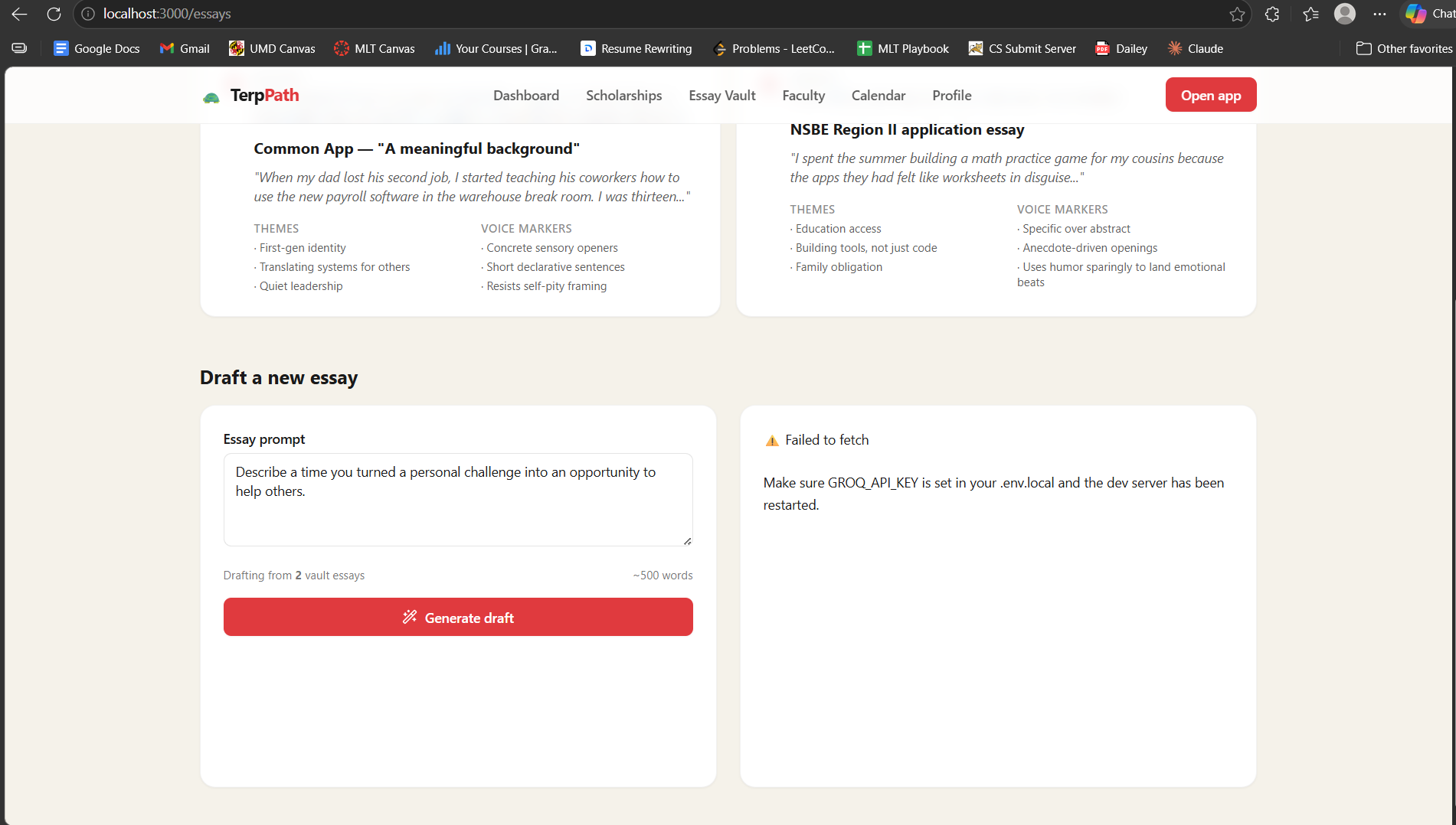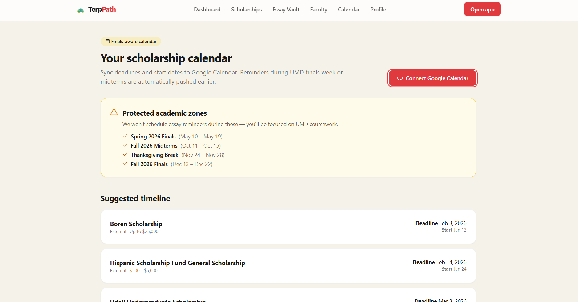 Many students at the University of Maryland miss out on scholarships they qualify for because the process is confusing, scattered, and time-consuming. As students ourselves, we saw how hard it is to find opportunities, manage deadlines, and write strong essays while balancing school. We wanted to build something that makes accessing funding simple and personal.