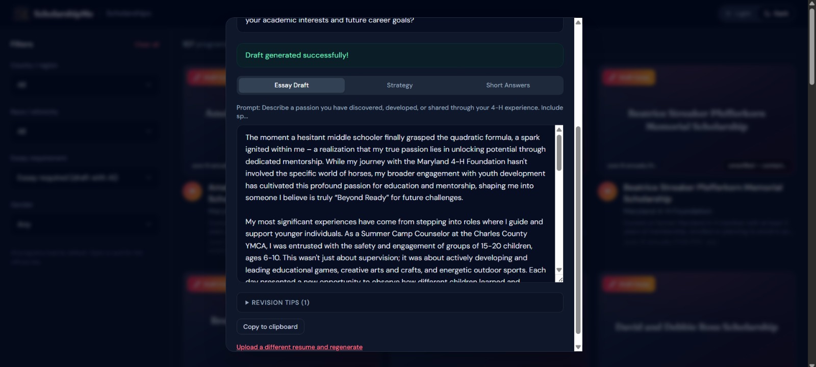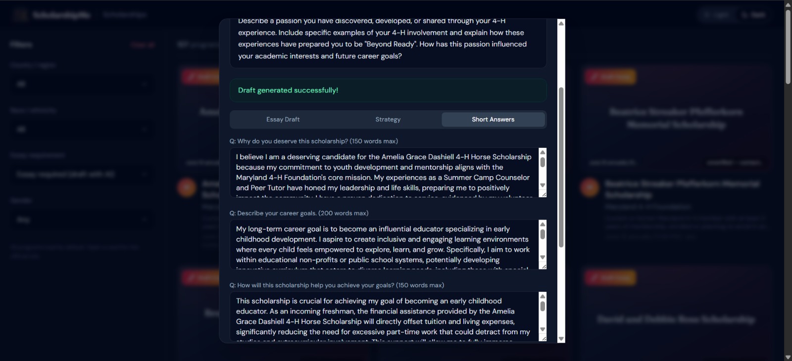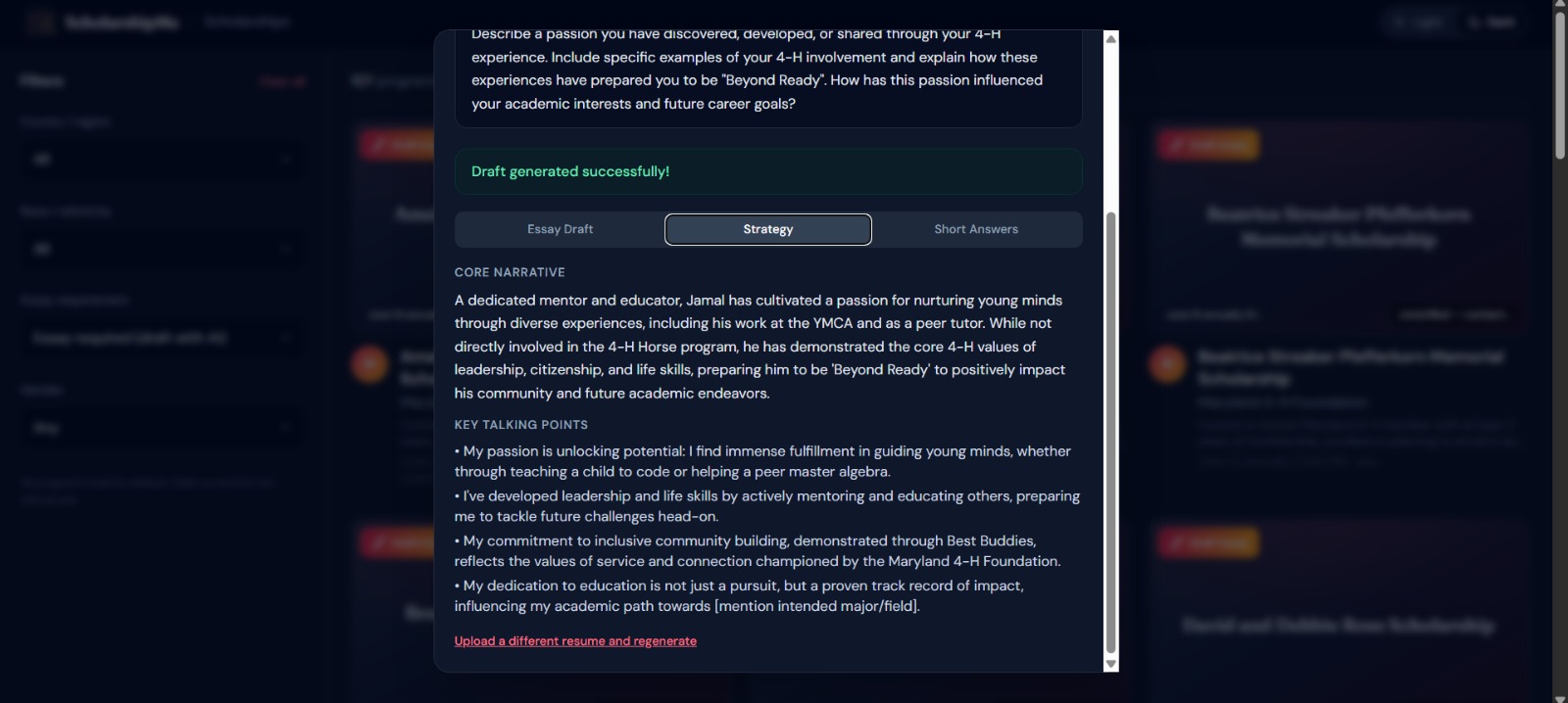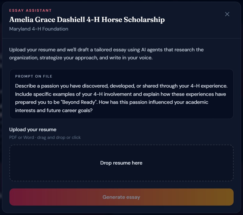 AI-powered essay drafting — For scholarships that require essays (60% of our database), users upload their resume and a 4-agent AI pipeline researches the organization, strategizes the application angle, writes a polished draft, and formats everything for export, in under 60 seconds.