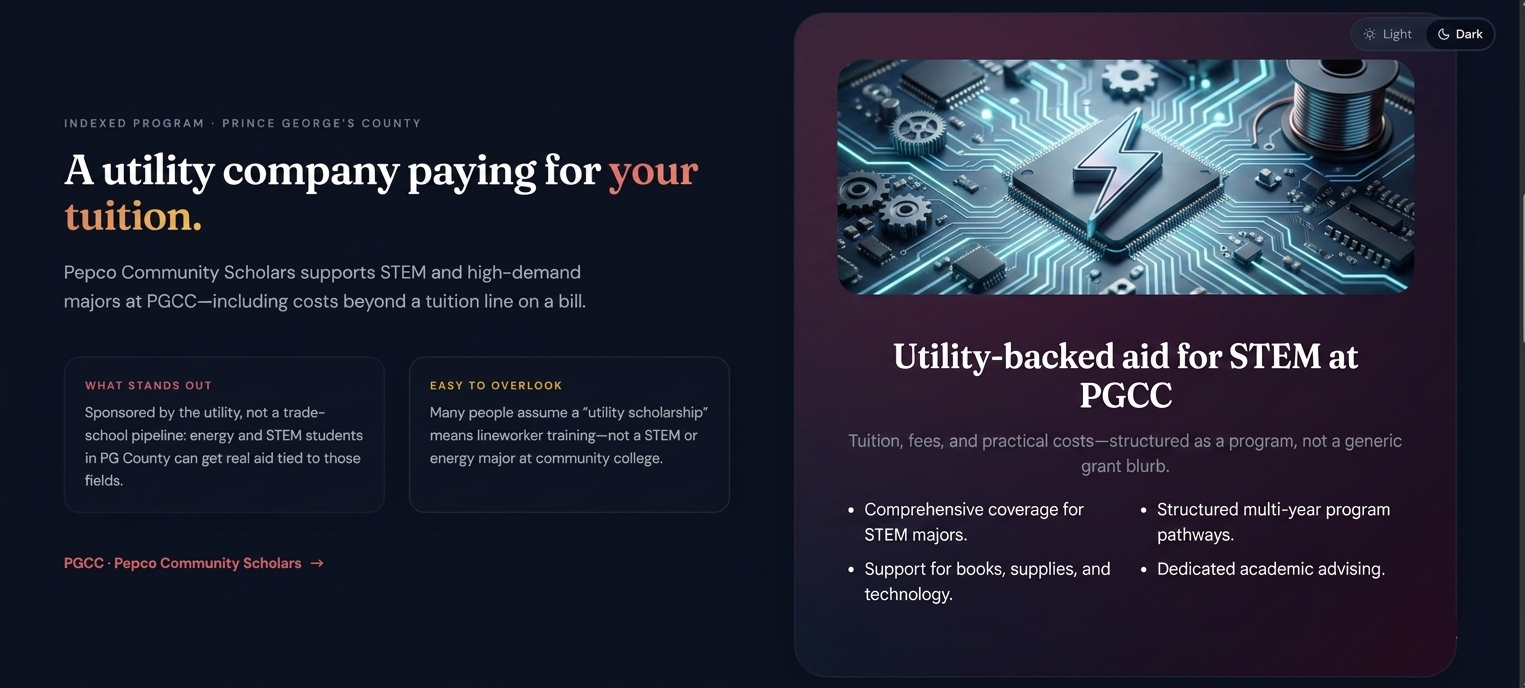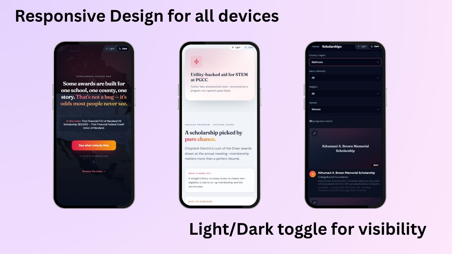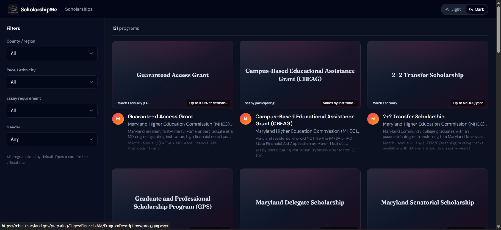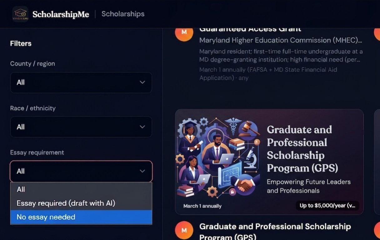 Hyper-local scholarship database — We built a searchable database of 131+ scholarships (for one specific location) that don't appear on major aggregator sites, scraped and verified from community foundations, civic organizations, Greek chapters, credit unions, and local employers across Maryland. Users can filter by county, race/ethnicity, gender, and essay requirements to find exactly what fits them. We compared the result with mainstream AI, It returned around 30 scholarships which is lesser than 25% of our scholarships.