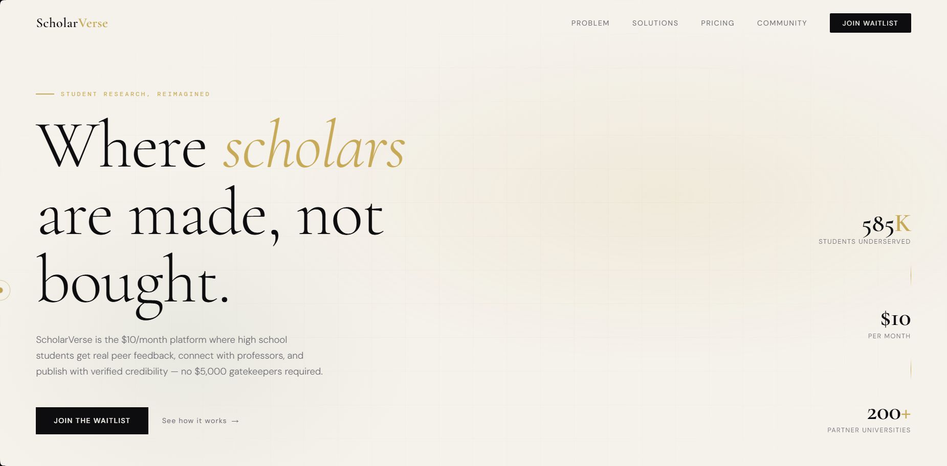 585,000 juniors and seniors in the US pursue serious research or advanced writing every year. Most of them are stuck with the same broken choice: pay a predatory journal for a fake credential, or get nothing at all.