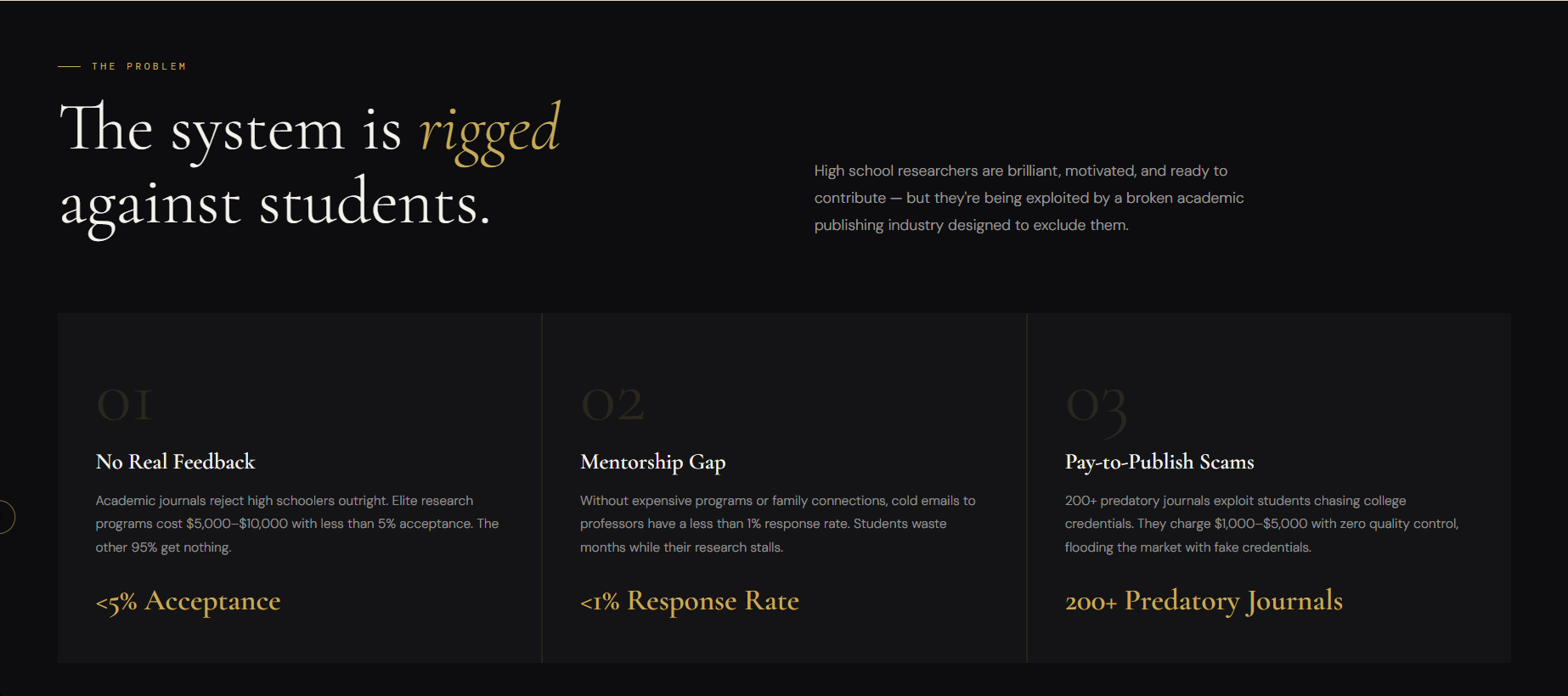 The legitimate research programs cost $5,00 to $10,000 and accept less than 5% of applicants. Cold emails to professors go unanswered, response rates sit below 1%. And then there are the "journals" that flood search results when a student types "how to publish high school research", offering a publication credit for $1,000, $2,000, sometimes $3,500. No real review. No feedback. Just a credential that looks real and means nothing.