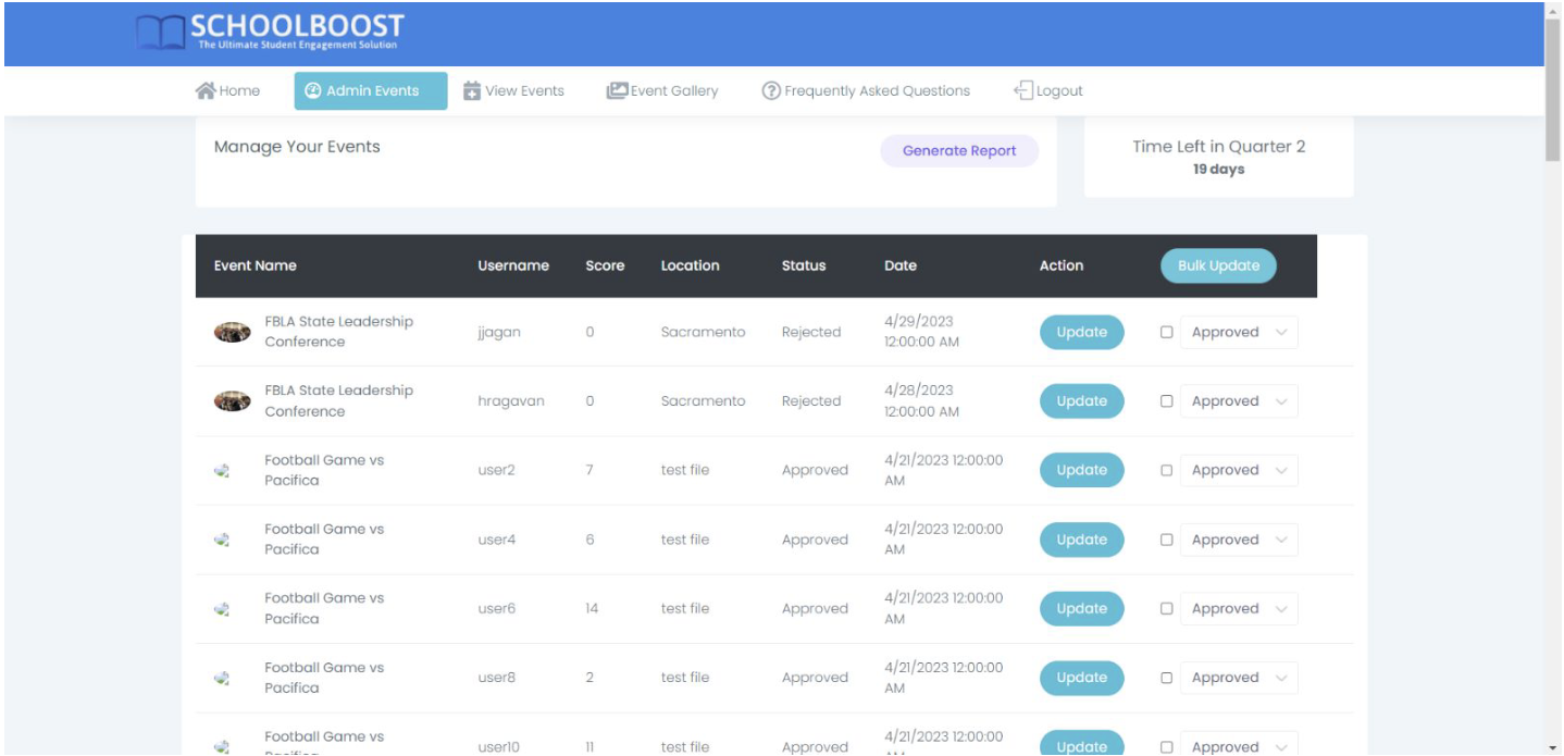 - Admin Events Page: Admin interface for managing events, generating reports, and bulk updating event statuses.