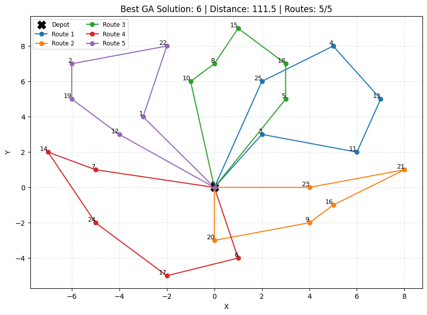 These constraints enforce that each customer is visited exactly once, flow is conserved, each route starts and ends at the depot, and vehicle capacity is respected.