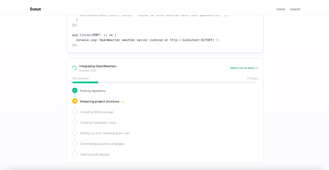 - Deep Devin Integration: Instead of just sending a PR, we're building a direct Devin "Resident Engineer" connection. You'll be able to invite Scout directly into your Devin environment, allowing it to autonomously monitor your project for deprecated APIs and suggest upgrades in real-time.