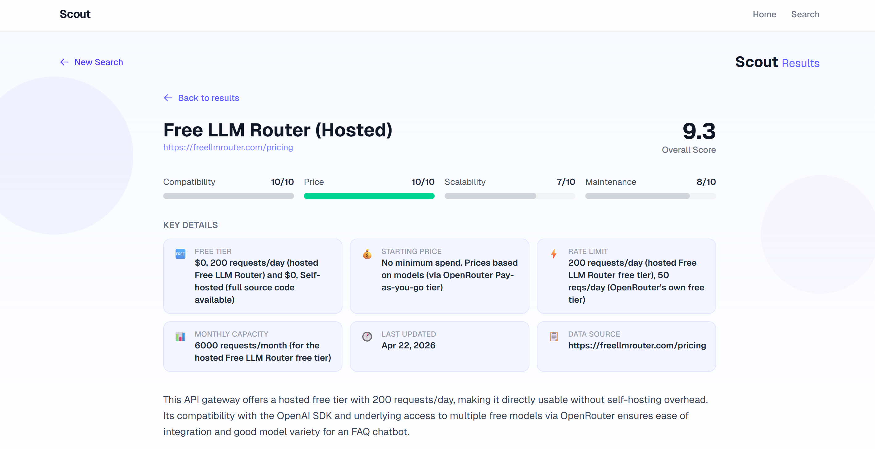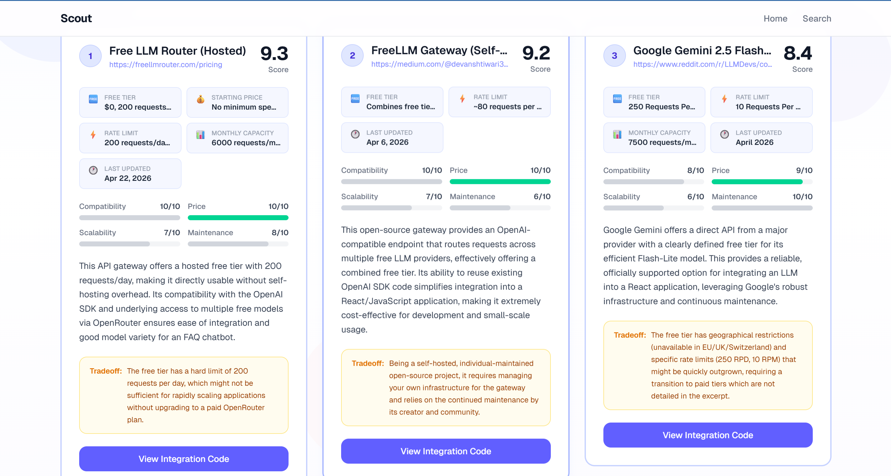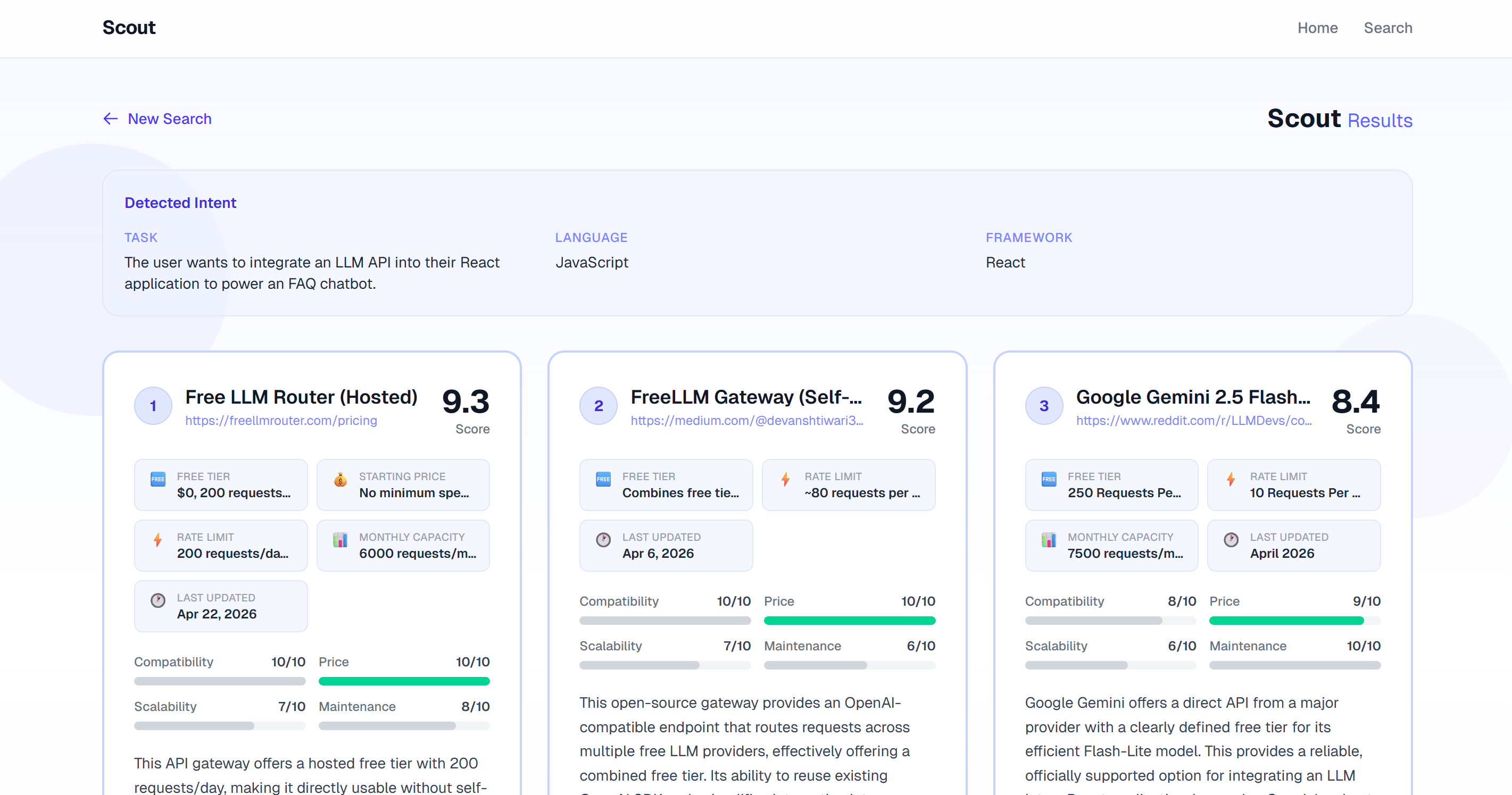 Whether it’s finding the strongest LLM model for your startup, the fastest image recognition API for your company’s codebase, or the cheapest authentication API for your hackathon project, Scout finds the best options for you.