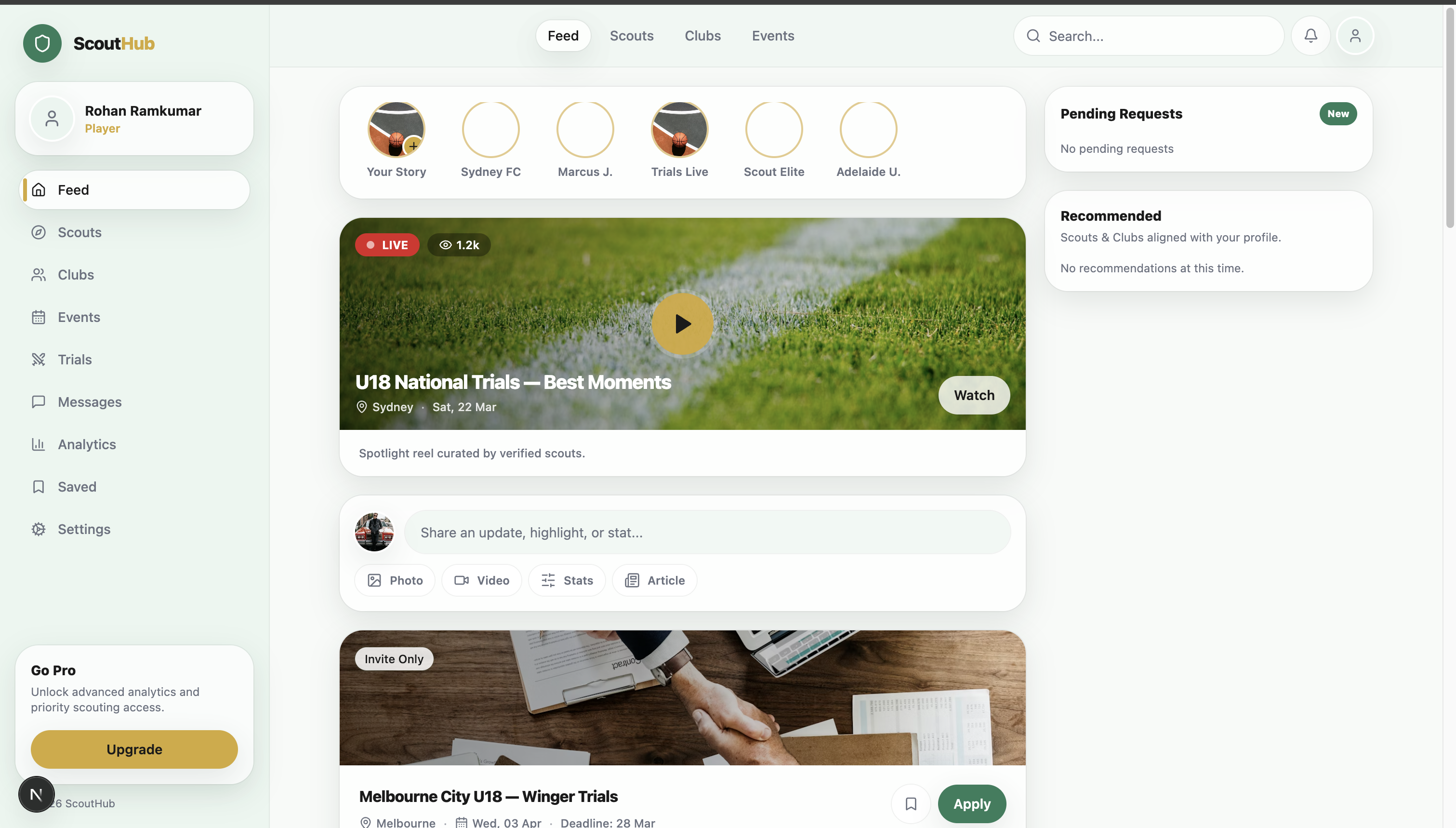Talent is distributed equally; opportunity is not. In grassroots sports, getting scouted still relies entirely on blind luck—being at the right match, on the right day, in front of the right person. We watched incredibly talented athletes get overlooked simply because they lacked the right network or were buried under archaic recruitment methods like paper binders and highlight DVDs. We built ScoutHub to democratize discovery, shifting the focus from who you know to how you play.