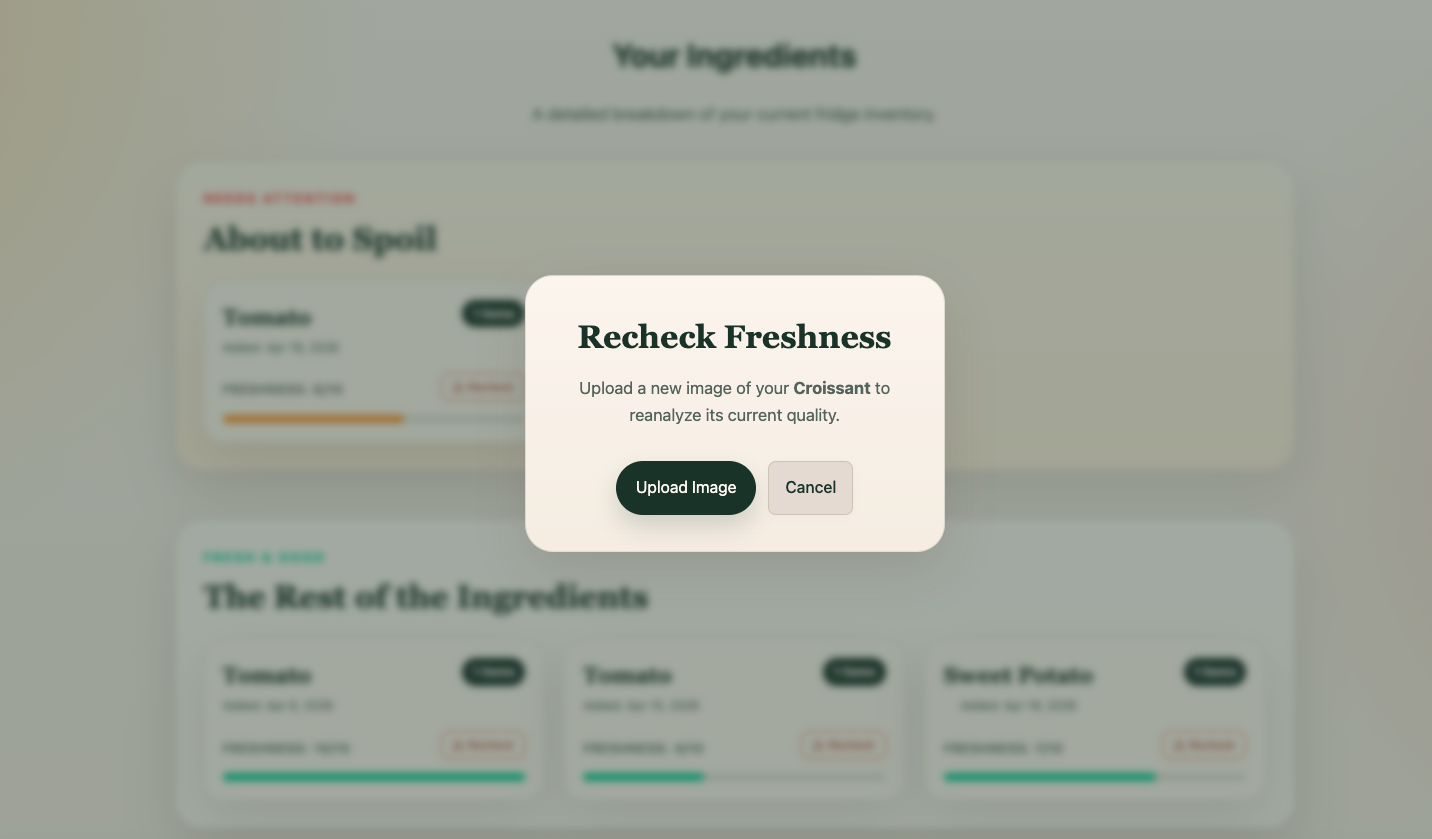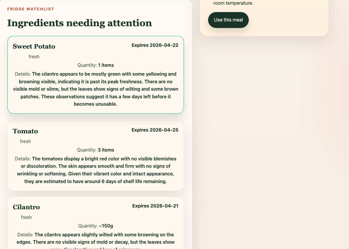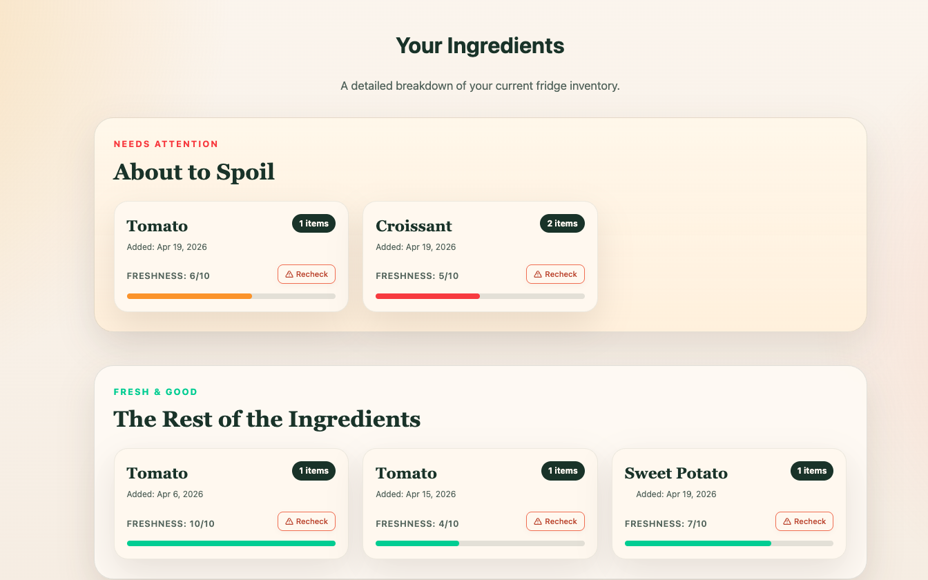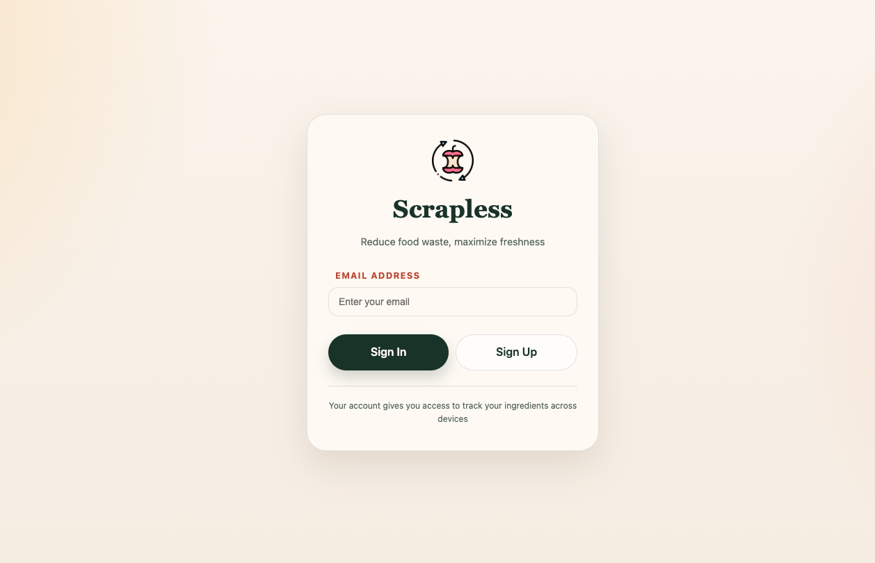 Scrapless helps users track their ingredients and turn them into meals before they go bad. Users can upload ingredients, view freshness and expiration information to track their usability, and receive AI-generated meal suggestions tailored to what they already have. With a single click, they can “use” a meal, which updates their inventory and reflects what’s been used to make a meal. Ingredient freshness and expiration are dynamically updated to reflect spoilage over time. The goal is to make reducing food waste effortless and actionable.