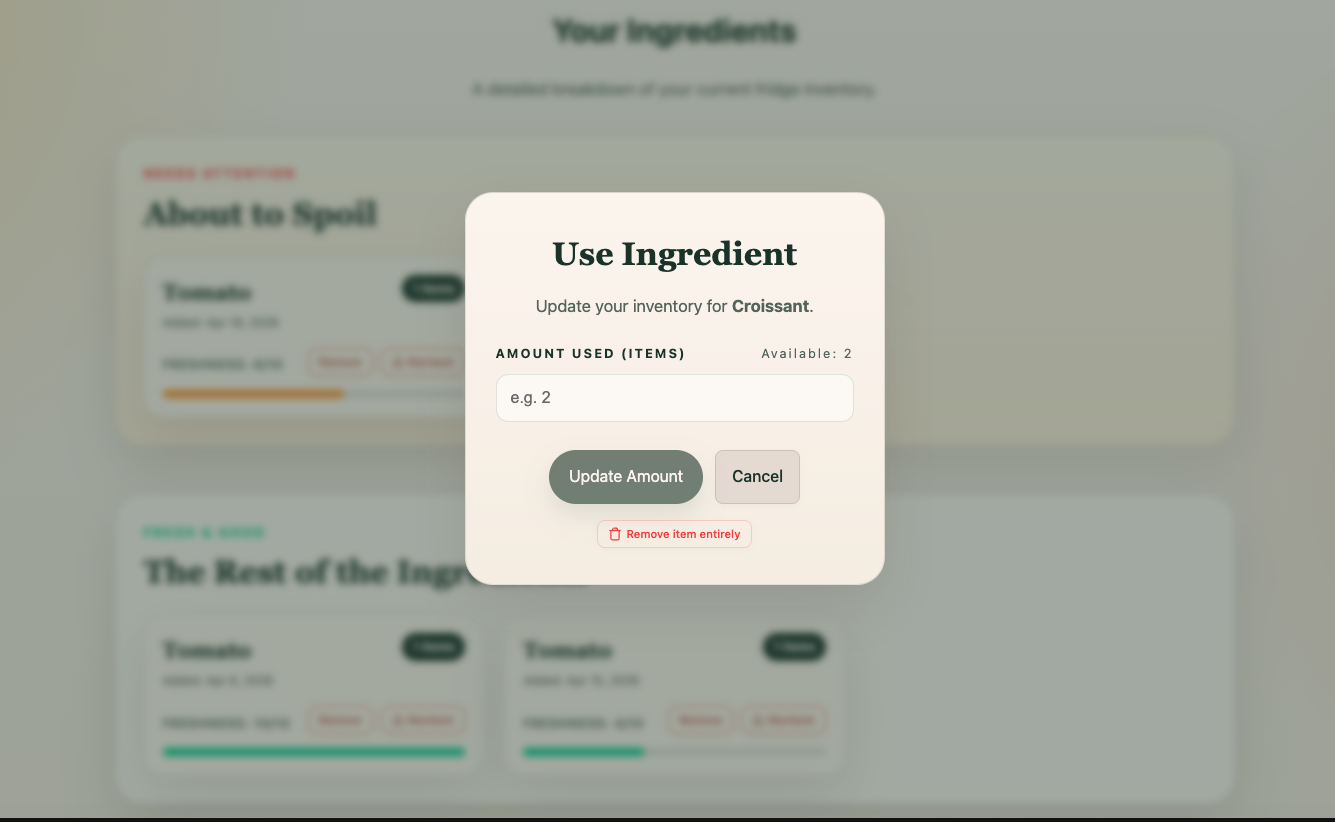 - Be able to “Use” a meal, automatically deleting the items from the database