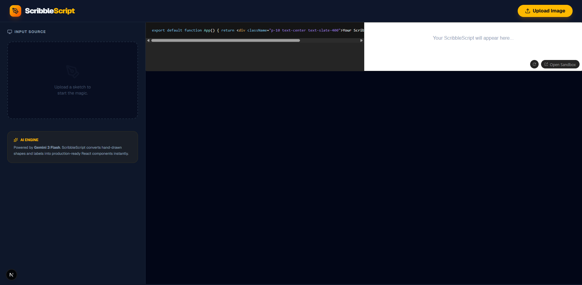 ScribbleScript is the bridge between my pen and my production code. You just snap a photo of a hand drawn sketch and upload it. The engine, powered by Gemini 3 Flash, reads the handwriting and layout to generate clean React code using Tailwind CSS. It doesn't just show a picture; it renders a functional, interactive prototype right in the browser.