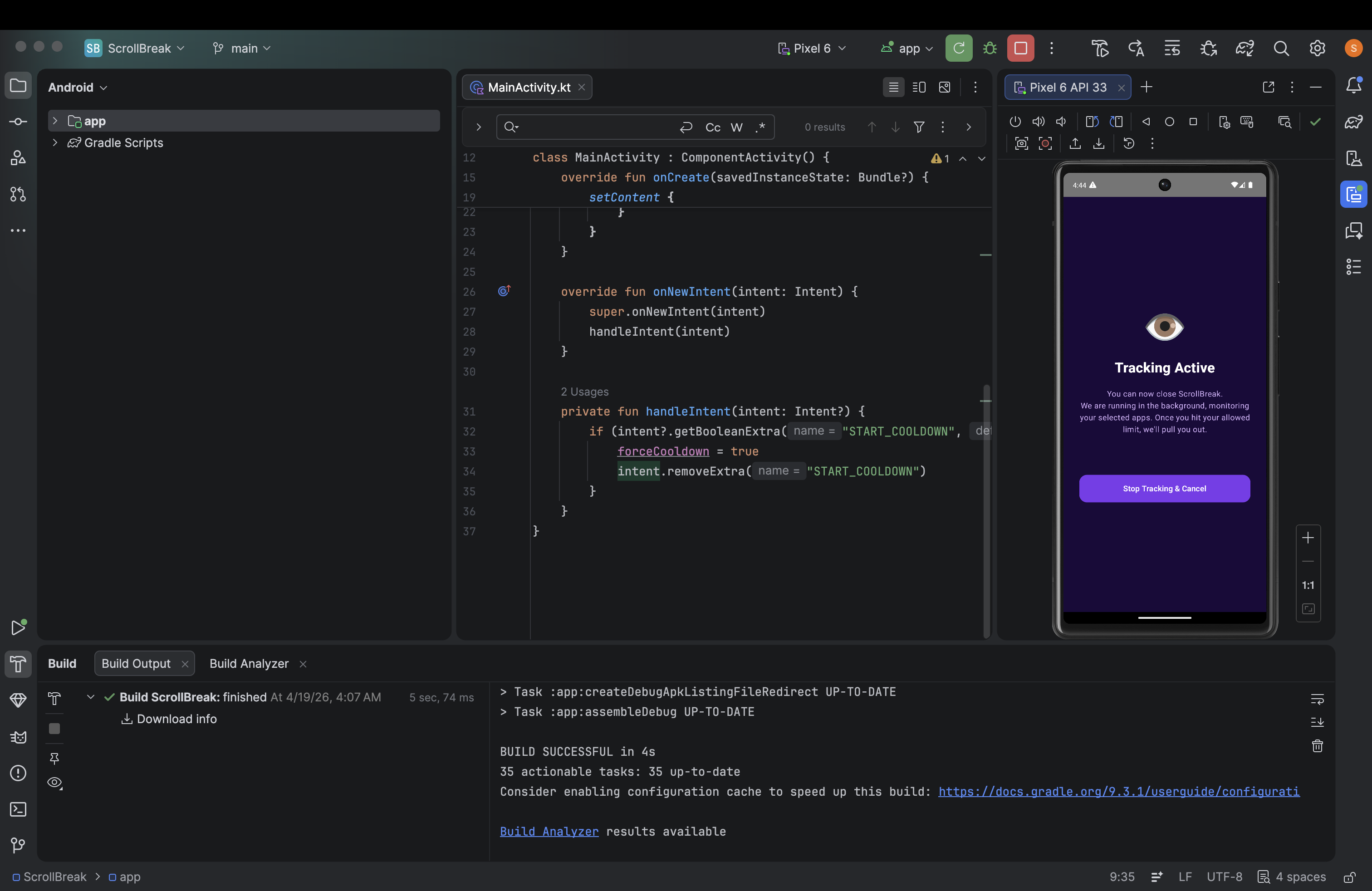 I built ScrollBreak as an Android app using Android Studio for development. During the process, I also used Antigravity as part of the workflow while building and shaping the app experience.