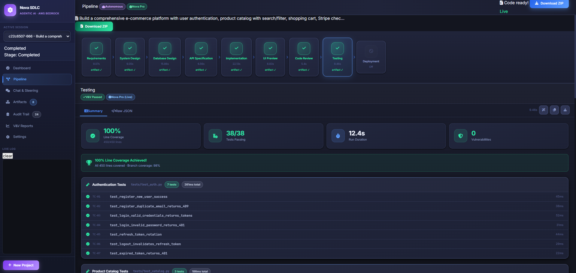 Nova SDLC Architect converts a plain-language requirement, voice description, or image-based design into a complete software project by orchestrating eight specialized Amazon Nova AI agents, each responsible for a stage of the Software Development Lifecycle.