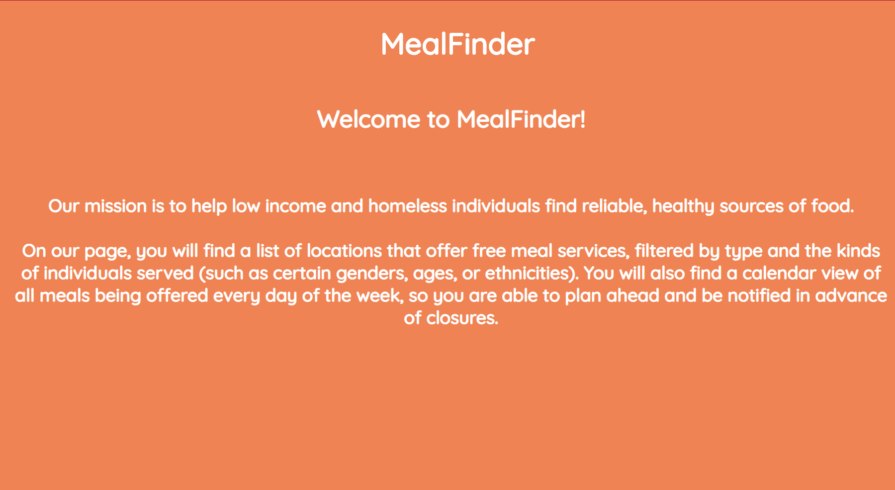 We are looking to incorporate all the time slots for each food bank. Additionally, we hope to incorporate a map where it will show the user where the food bank is with respect to their location. This map currently only applies to the Seattle area, but once it works, it should be simple to parse in data sets from different areas to create a comprehensive map for Washington or the USA.
