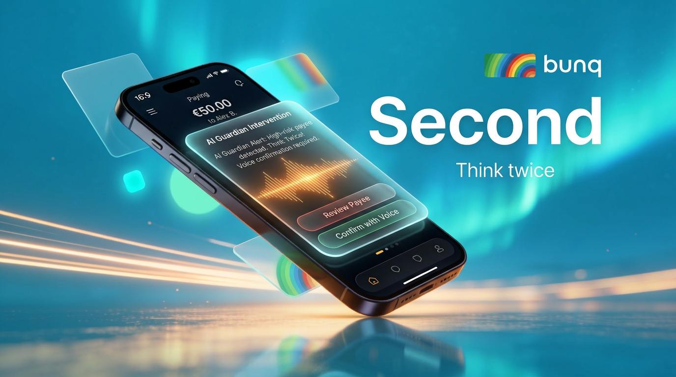 Second is a live, voice-first, vision-aware guardian built into bunq. It intercepts payments at the moment they're about to happen and opens a real conversation with the user — in the voice they actually listen to.