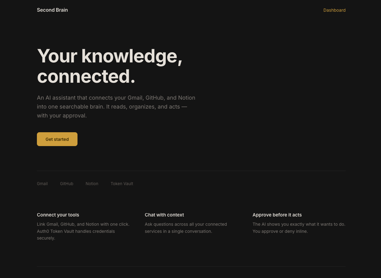 The idea behind Second Brain was to let an AI do that glue work. But the problem with connecting to Gmail, GitHub, and Notion is that each one needs OAuth. That means token exchanges, scopes, refresh logic. Token Vault handled all of that. I set up each service as an Auth0 social connection, and my app just calls exchangeTokenVault() to get a fresh access token whenever a tool needs one. No tokens stored in my database, no refresh logic in my code.
