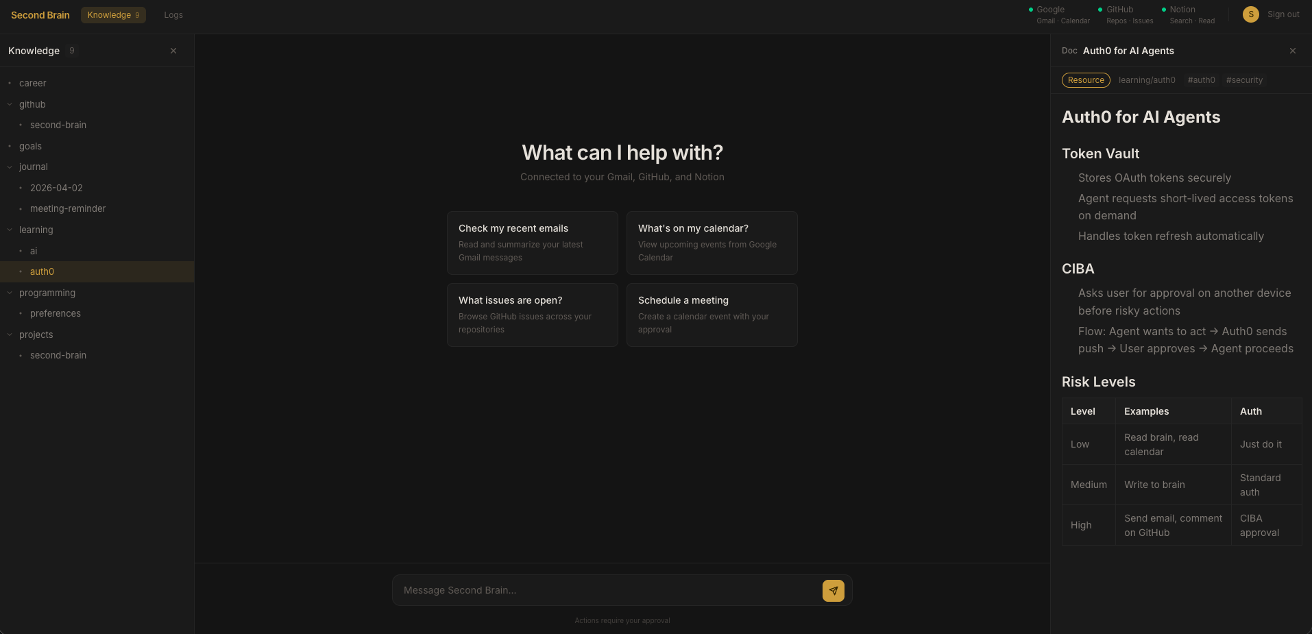 I've been running my life out of a personal knowledge repo for months. Journal entries, career tracking, learning resources, project notes, all organized as markdown, all managed with AI. The AI could store and organize information, but it couldn't actually do anything. It couldn't read my emails, check my GitHub issues, or search my Notion pages. When the Auth0 hackathon came along with Token Vault, the idea clicked: give my Second Brain hands.