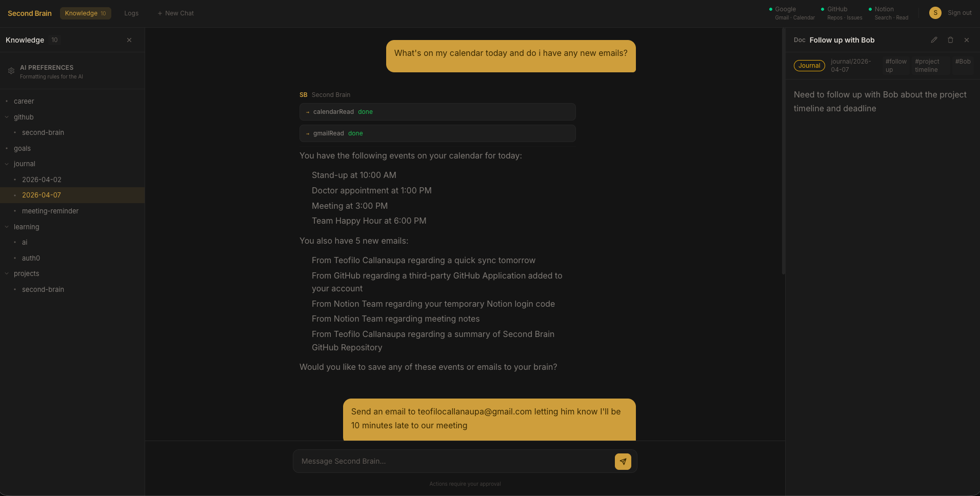 Second Brain is an AI chat interface that connects your Gmail, Google Calendar, GitHub, and Notion into one place. You can ask it to read your recent emails, check your schedule, search your GitHub repos, browse your Notion pages, and cross-reference everything against your personal knowledge base. The knowledge base comes with an inline markdown editor so you can edit entries directly without going through the AI. There's also a customizable AI Preferences file where you define your preferred formatting and writing style, and the AI follows those rules when creating new entries. When the AI wants to do something risky like sending an email, creating a calendar event, or posting a comment, it pauses and shows you exactly what it's about to do with an inline approval card. You approve or deny before anything happens.