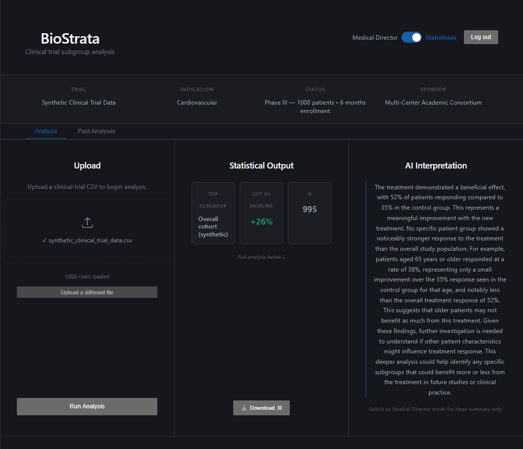 The other challenge was generalizing across any trial. Every CSV has different column names and structures. BioStrata infers the trial structure dynamically so it works on any dataset a researcher uploads.