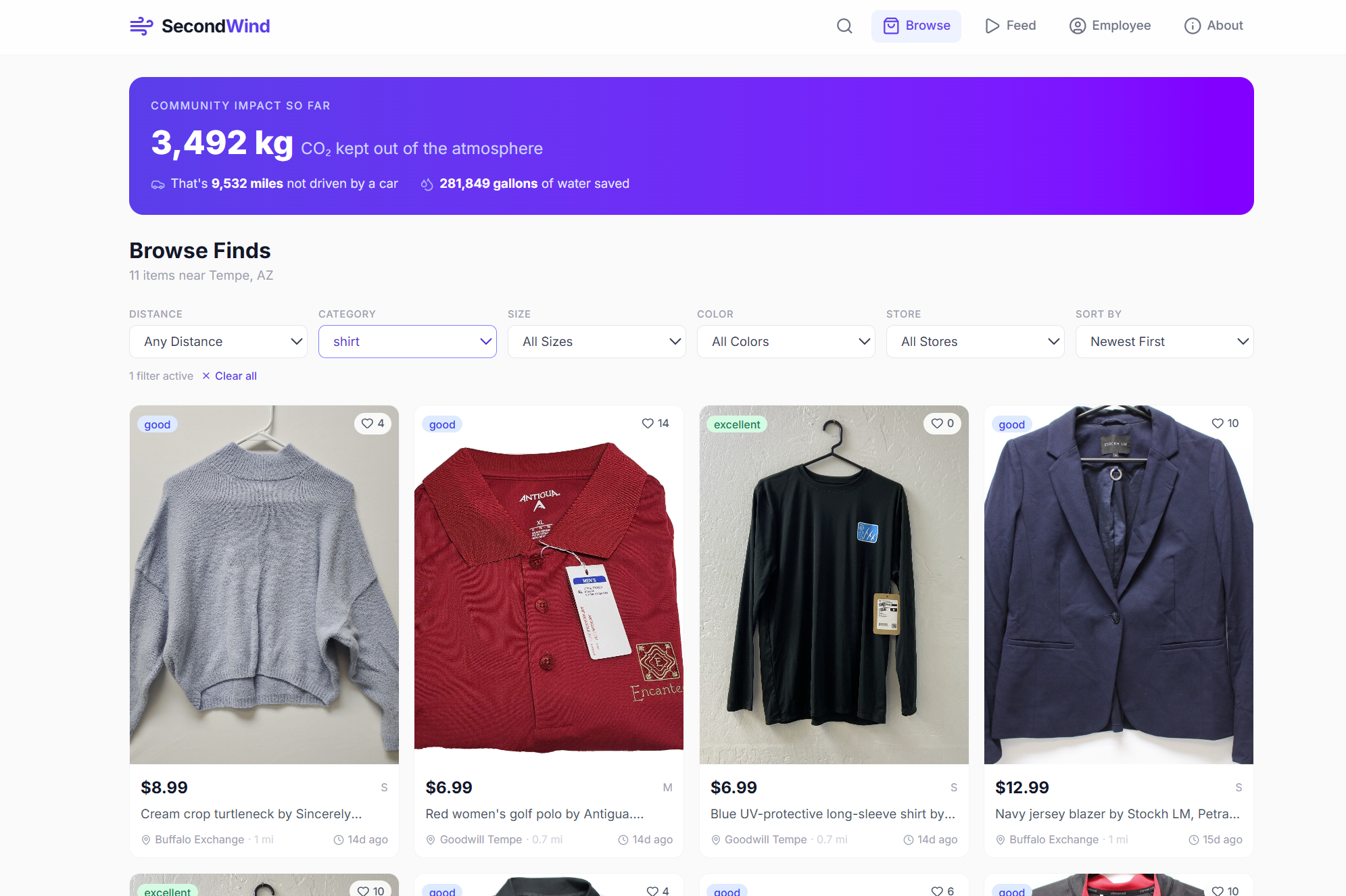 SecondWind enables secondhand store employees to document items simply by snapping a few pictures. Gemini AI Vision analyzes the photos and auto-generates structured listings, extracting the item's type, brand, size, color, material, condition, and price from its appearance and tags. These listings populate a browsable, searchable online catalog. Every item links to a real store nearby. A carbon badge on each item shows exactly the CO₂ and water avoided by buying secondhand instead of new, helping consumers make sustainable purchasing decisions.