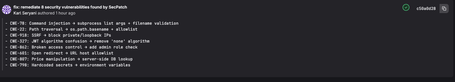 SecPatch is an AI pentesting agent that lives inside GitLab. Mention it on any merge request and it runs a full security review. It traces data flows through your code, finds vulnerabilities, writes proof-of-concept exploits, maps findings to CWE/CVSS, and pushes fix commits. All automatic, all within GitLab.