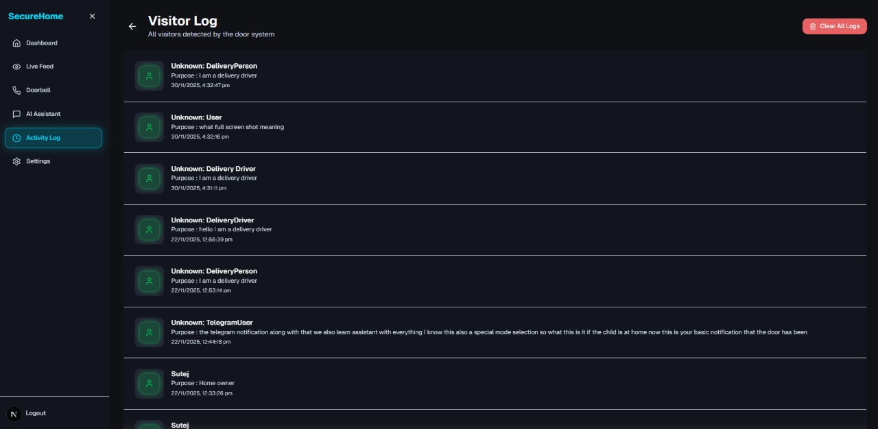Visitor log showing AI-classified entries with purpose and timestamps