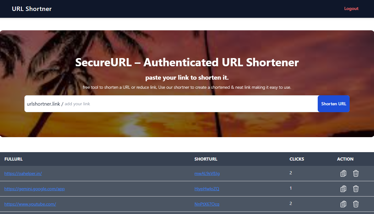 This inspired me to build SecureURL, a URL shortener that not only shortens links but also allows users to securely manage their links through authentication and a personal dashboard. I wanted to explore how authentication systems like JWT can be integrated into a simple but useful web tool.